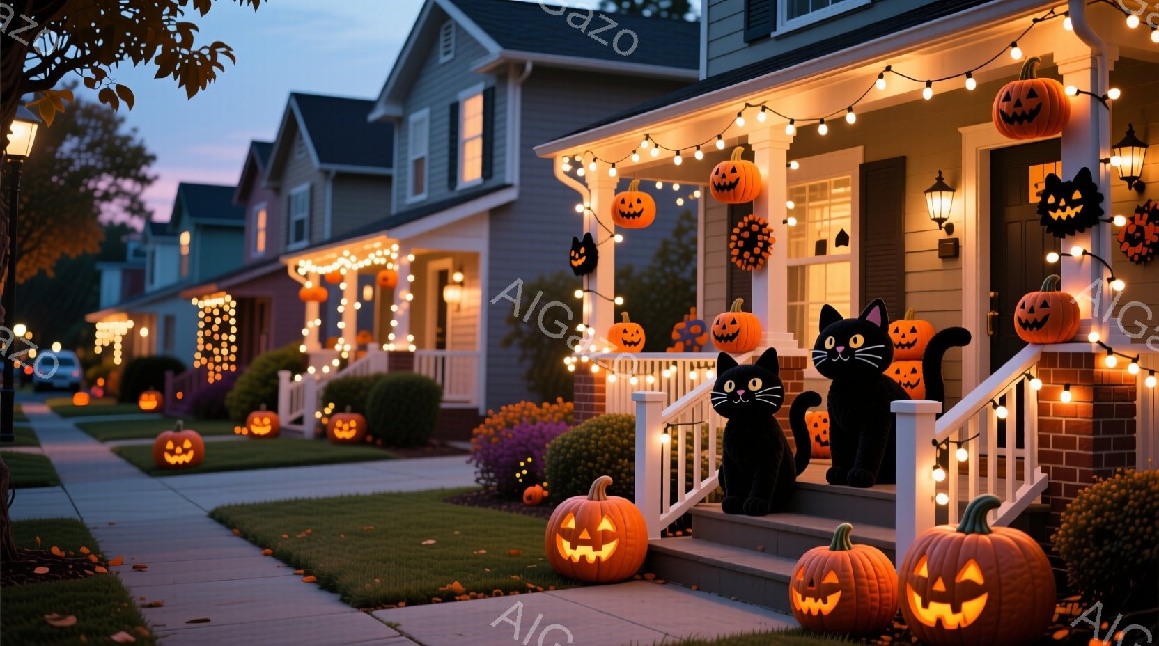 ハロウィーンの装飾が施された住宅街の風景です。各家の玄関先には、様々な大きさのジャック・オ・ランタンや黒い猫の置物が飾られ、オレンジ色の電飾が通りを明るく照らしています。背景には整然とした芝生と住宅が並び、夕暮れ時の穏やかで祝祭的な雰囲気が漂っています。