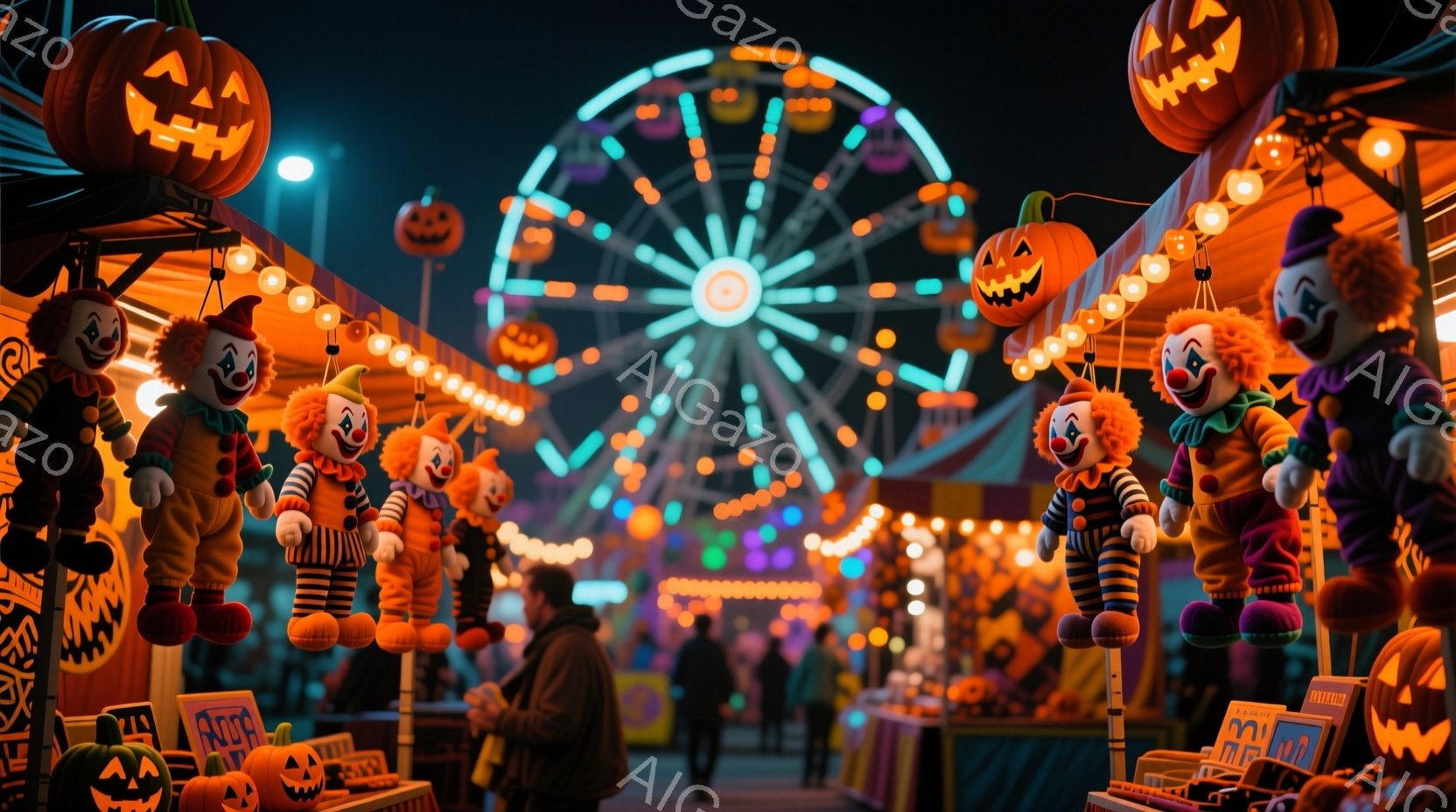 ハロウィーンの夜の賑やかな祭りの様子が描かれています。屋台にはカラフルな縫いぐるみの道化師やカボチャが飾られ、背景にはライトアップされた観覧車が見えます。多くの人々が楽しそうに歩き回り、暖かい光が全体を包み込み、お祭りの活気と楽しさを表現しています。
