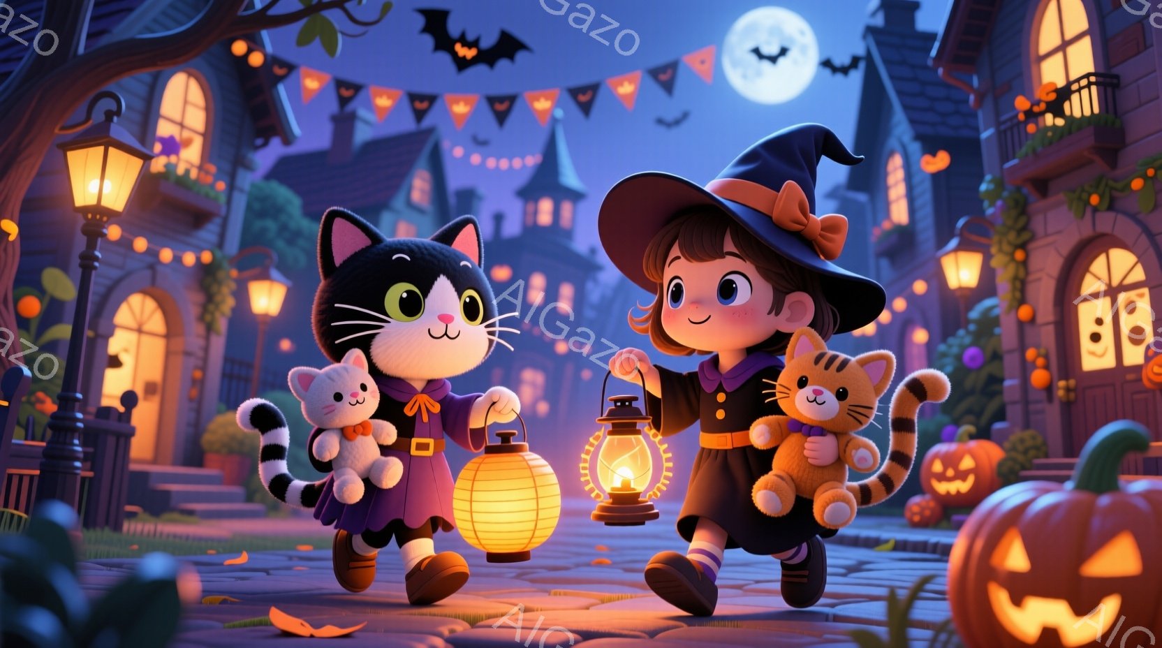 魔女の帽子をかぶった少女が、黒猫と手をつないで石畳の道を歩いている。彼女は紫色のドレスとオレンジ色の靴を履いており、両手に提灯を持って、少し微笑んでいる。背景には、カボチャが飾られた家々が立ち並び、月明かりの下でハロウィーンの夜の温かく幻想的な雰囲気が漂っている。