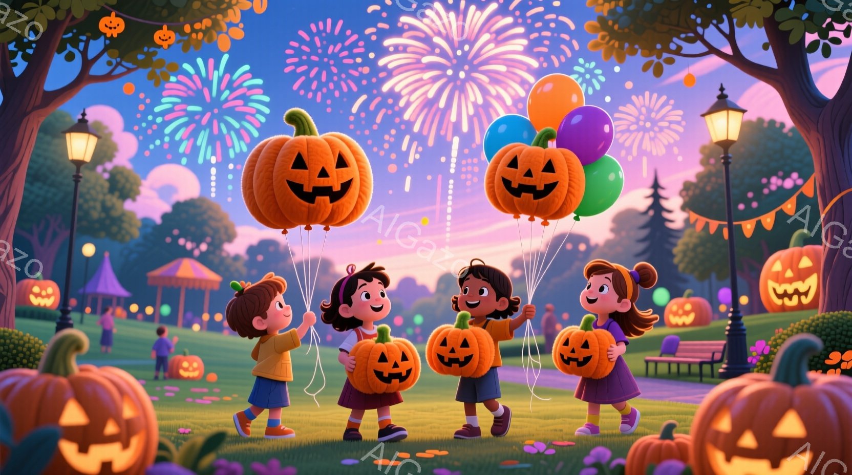 3人の子供たちは、それぞれハロウィンのカボチャの風船を持って立っており、明るい笑顔を浮かべています。女の子はピンク色の髪を結び、黄色のシャツと紫色のズボンを着用し、男の子は茶色の髪で、同様の服装をしています。背景には、様々な大きさのカボチャ、木々、そして夜空に打ち上げられる花火が見え、お祝いムードを盛り上げています。