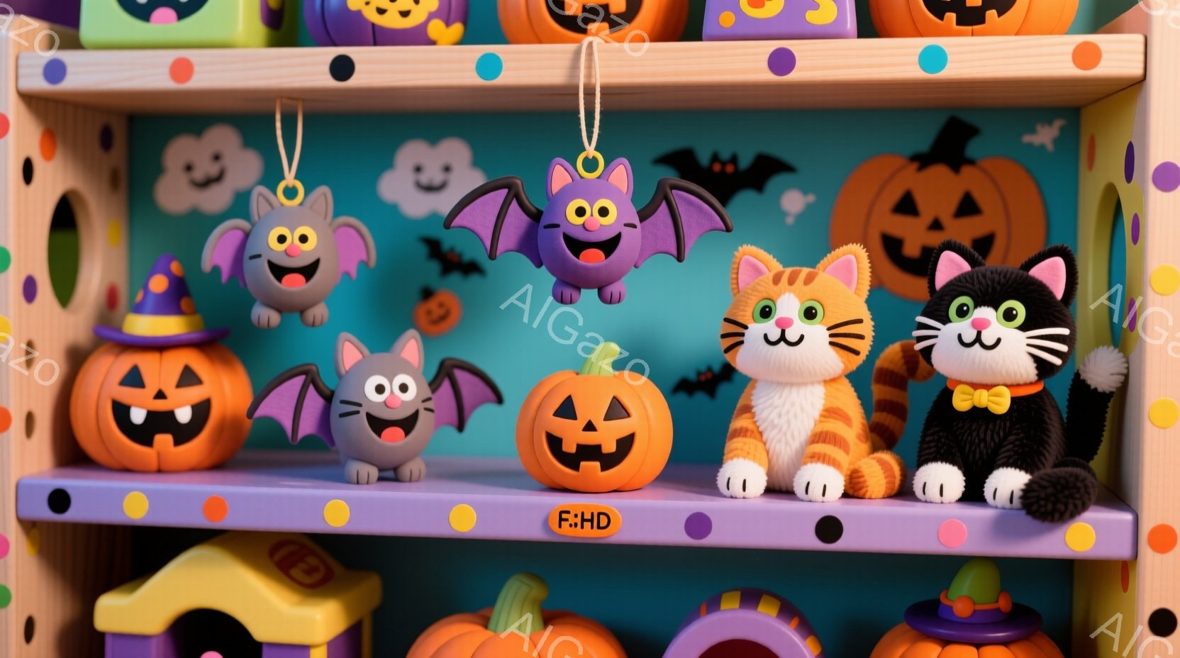 木の棚には、ハロウィーンをテーマにしたおもちゃが並べられています。カボチャのランタン、幽霊、コウモリ、そしてオレンジと白の猫のぬいぐるみがあります。全体的に明るく、お祝いムードで、お祭りの準備をしているような楽しい雰囲気です。