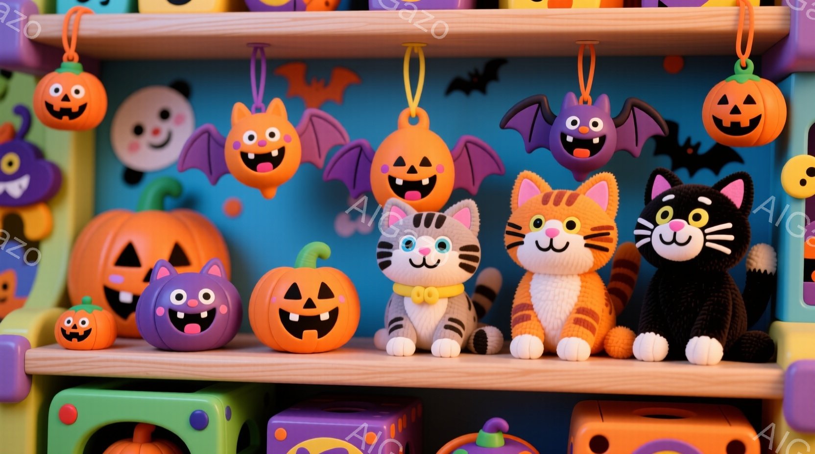 ハロウィーンをテーマにした可愛らしいおもちゃの展示が棚に並んでいます。紫色の帽子をかぶった猫、緑色のカボチャ、オレンジ色の猫、紫色のコウモリの飾りなどが、楽しげな表情で並べられています。背景にはオレンジ色のカボチャの装飾が散りばめられ、全体的に明るく、お祝いの雰囲気が漂っています。