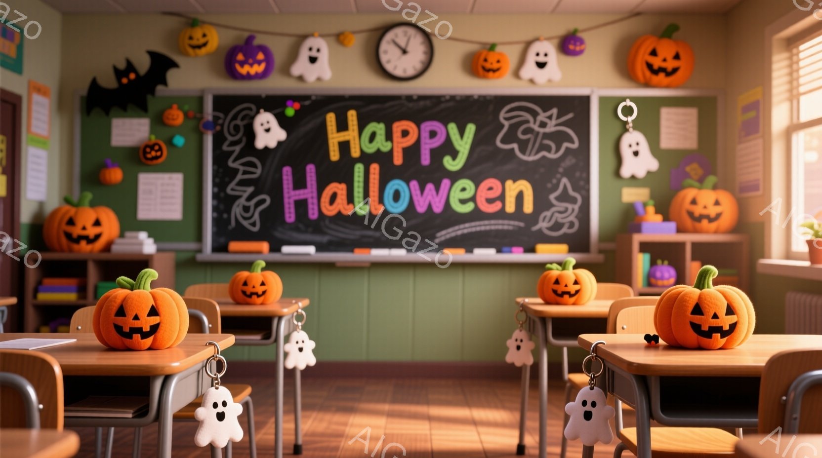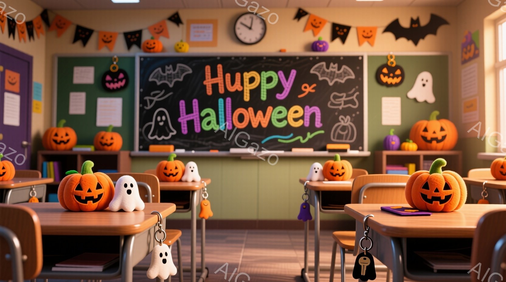 教室には、ハロウィーンの飾り付けがされており、黒板には「Happy Halloween!」と書かれています。机の上には、可愛らしいジャック・オ・ランタンと幽霊の飾りがあり、ハロウィーンの楽しい雰囲気を醸し出しています。全体的に暖かく、お祝いムード満載の空間です。