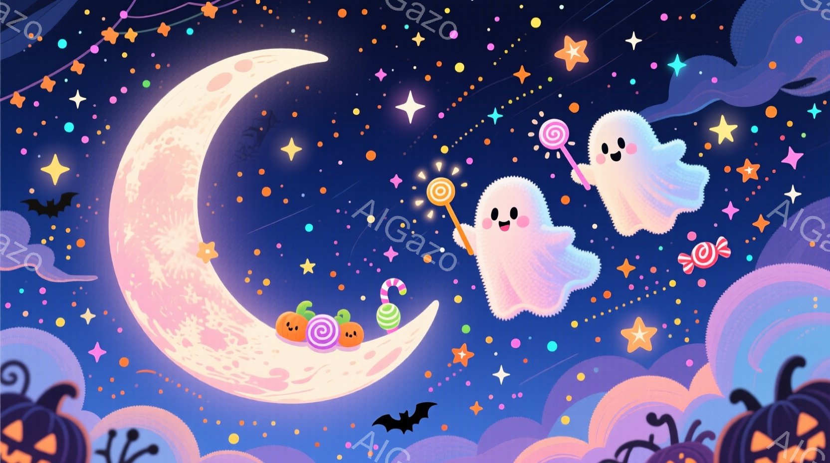 夜空を背景に、お菓子を持った可愛らしい幽霊が二人浮かんでいます。満月が大きく輝き、雲は淡いピンクと紫のグラデーションで表現され、ハロウィーンの夜を思わせる雰囲気です。背景には、かぼちゃのランタンやコウモリが散りばめられ、全体的に夢幻的で可愛らしい印象を与えます。