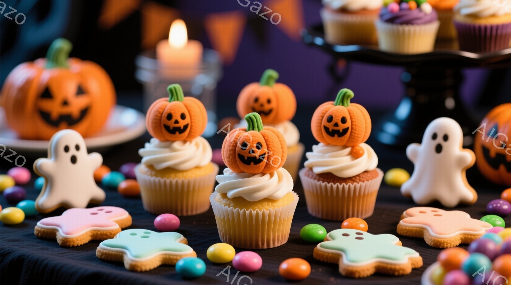 ハロウィーンをテーマにした焼き菓子が並べられています。茶色いカップケーキにはオレンジ色のジャック・オー・ランタンが飾られ、白いお化けのクッキーやパステルカラーのクッキーも添えられています。背景は黒い布で、カラフルなキャンディーが散りばめられており、お祝いムードを盛り上げています。