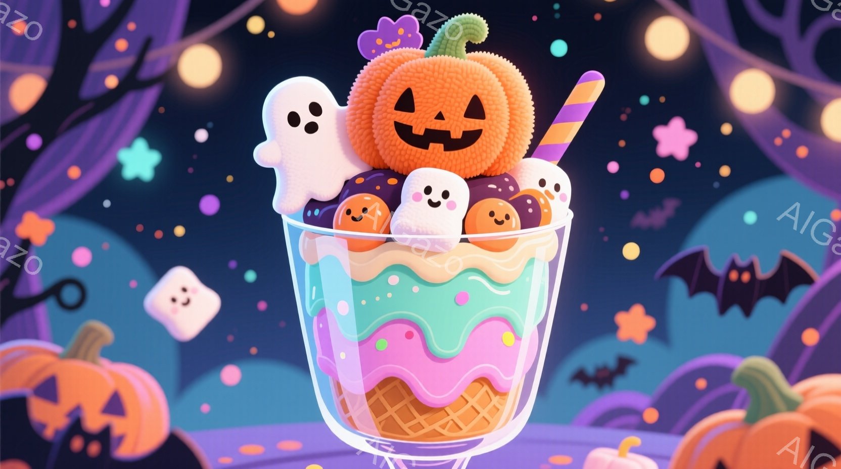 この無料AI生成画像「ハロウィーンをテーマにした焼き菓子が並べられています。茶色いカップケーキにはオレンジ色のジャック・オー・ランタンが飾られ、白いお化けのクッキーやパステルカラーのクッキーも添えられています。背景は黒い布で、カラフルなキャンディーが散りばめられており、お祝いムードを盛り上げています。」は、2025年10月25日に作成されました。 サイズは 1664×928px の高解像度で、商用利用も可能なフリー素材として提供しています。