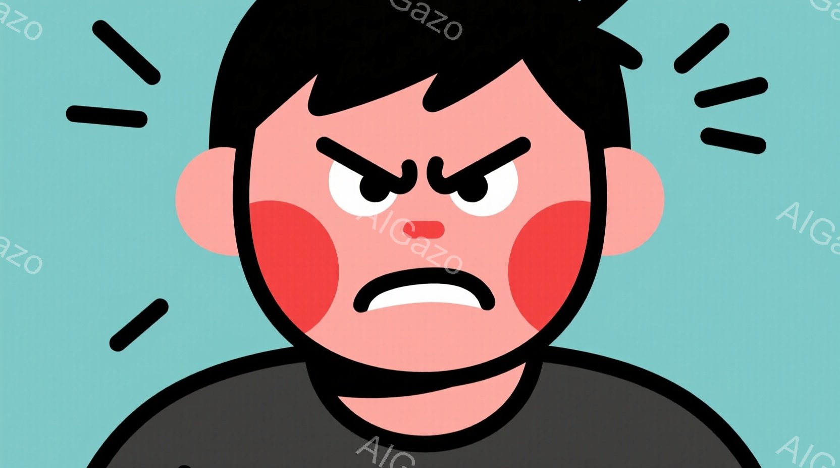 この無料AI生成画像「これは、頬を赤らめた怒った顔のイラストです。黒い髪型で、濃い眉としかめっ面で怒りを表しています。背景は薄い水色で、黒い線が放射状に配置され、緊張感を高めています。」は、2025年10月25日に作成されました。 サイズは 1664×928px の高解像度で、商用利用も可能なフリー素材として提供しています。