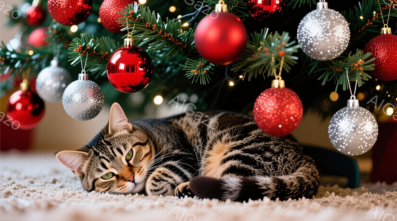 縞模様の猫が赤い毛布の上に丸まって横たわっており、緑色の目をわずかに開けてこちらを見ている。背景には、赤いオーナメントと銀色のボールで飾られたクリスマスツリーがあり、暖かく穏やかな雰囲気を醸し出している。毛布はオフホワイトのふわふわしたラグの上に置かれており、背景はぼやけている。
