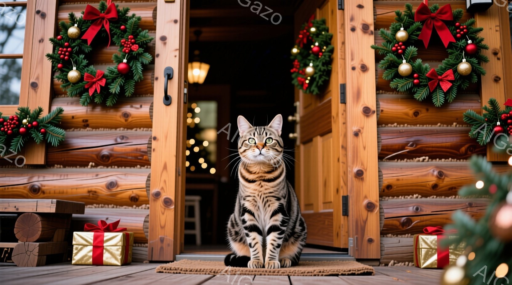 縞模様の猫が、クリスマスの飾り付けがされた家の玄関のマットの上に座っています。背景には、赤いリボンと金色の星で飾られたクリスマスリースが飾られた木製の壁があり、床には金色のリボンで結ばれたプレゼントボックスが置かれています。全体的に、暖かく、お祝いの雰囲気の冬のシーンです。