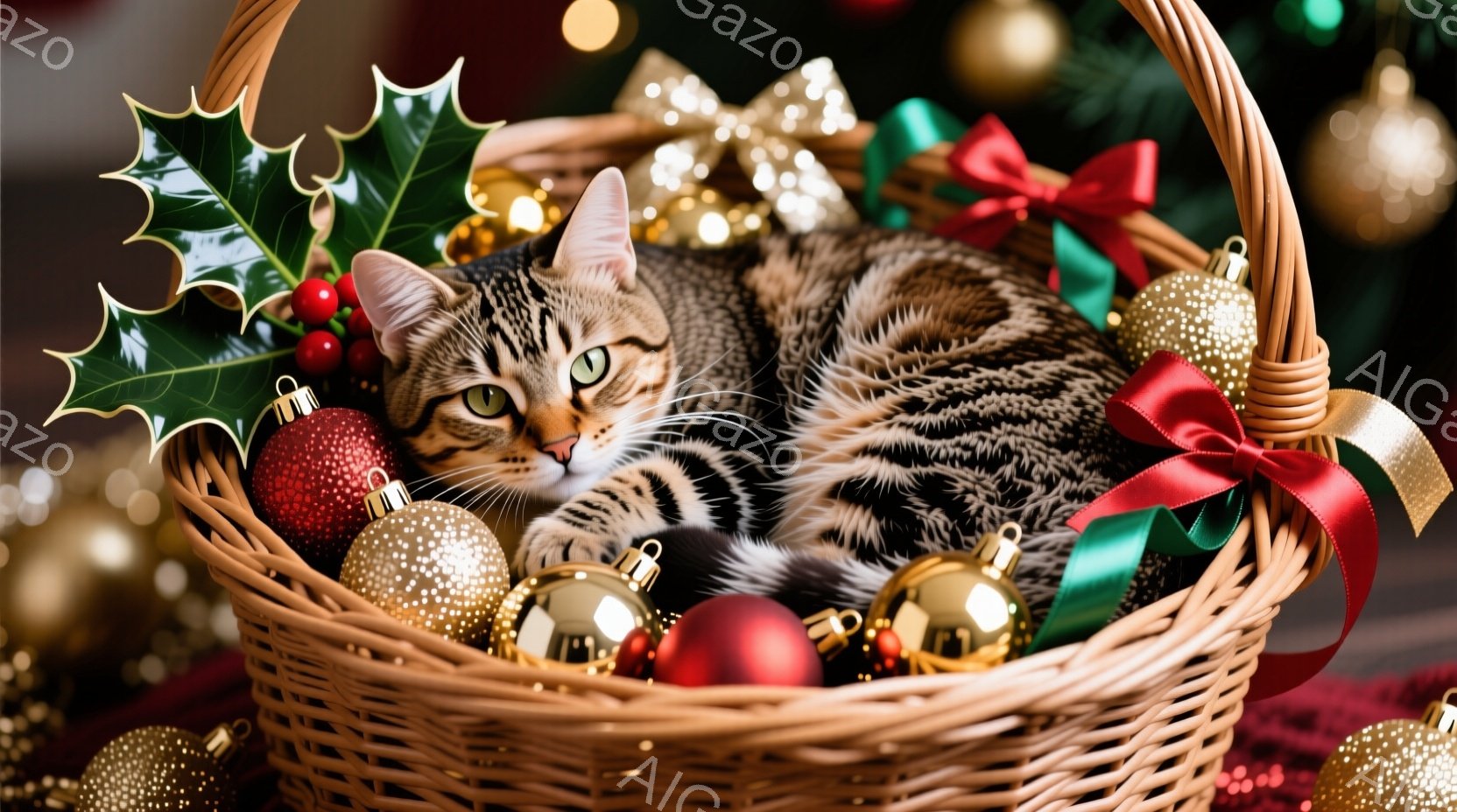 縞模様の猫が、クリスマスオーナメントで飾られた籐の籠の中に丸まって横たわっています。猫はリラックスした表情で、緑色の瞳がこちらを見つめており、周囲の金や赤の飾りとコントラストをなしています。背景はぼかされており、クリスマスの装飾が施されたお祝いの雰囲気が漂っています。