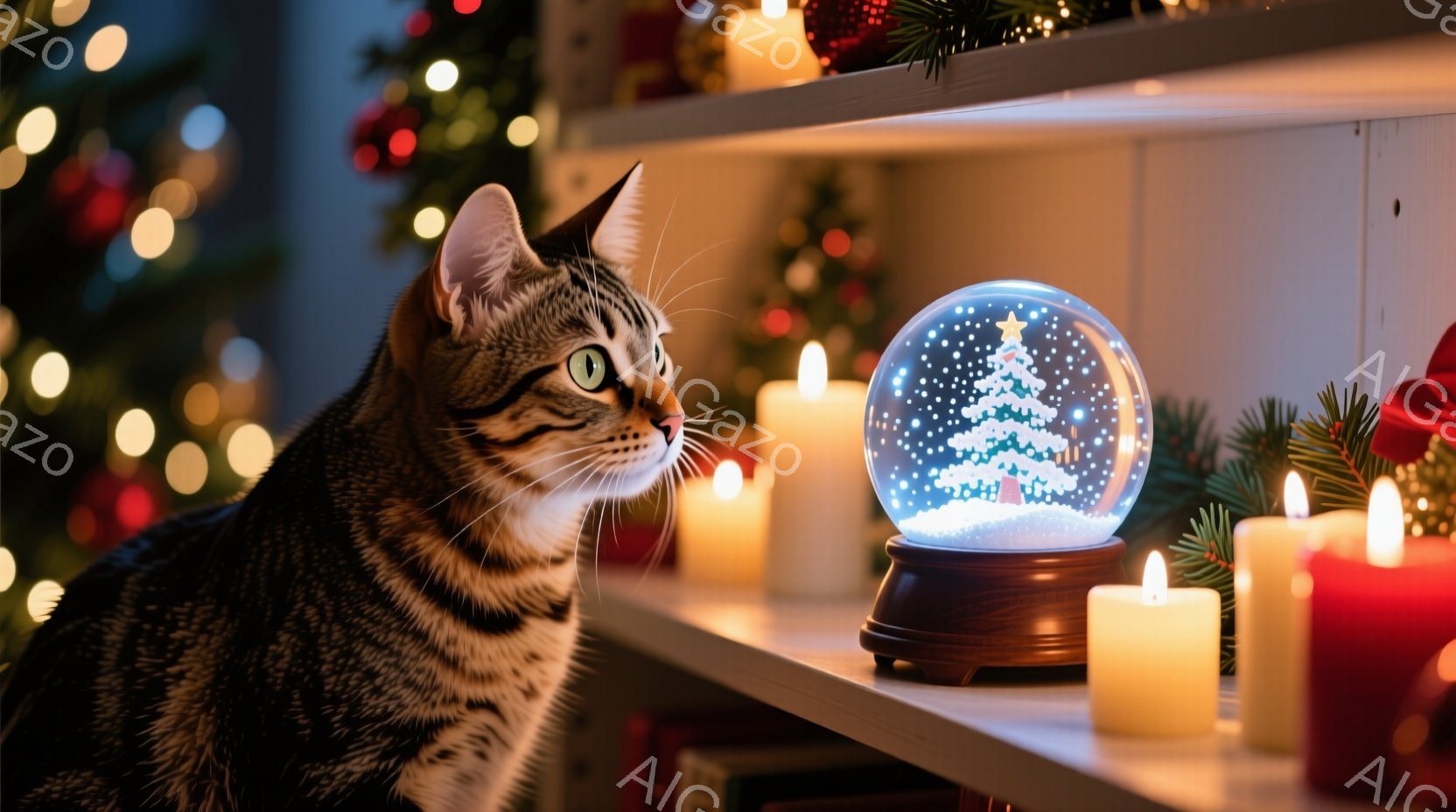 縞模様の猫が、クリスマスの飾り付けがされた棚を見つめている。暖炉の上の棚には、点灯したキャンドル、雪の結晶が散りばめられたクリスマスのツリーが入ったグラスボール、そして赤い飾りボールが置かれている。暖かく、穏やかで、お祝いの雰囲気が漂う冬の夜の光景だ。