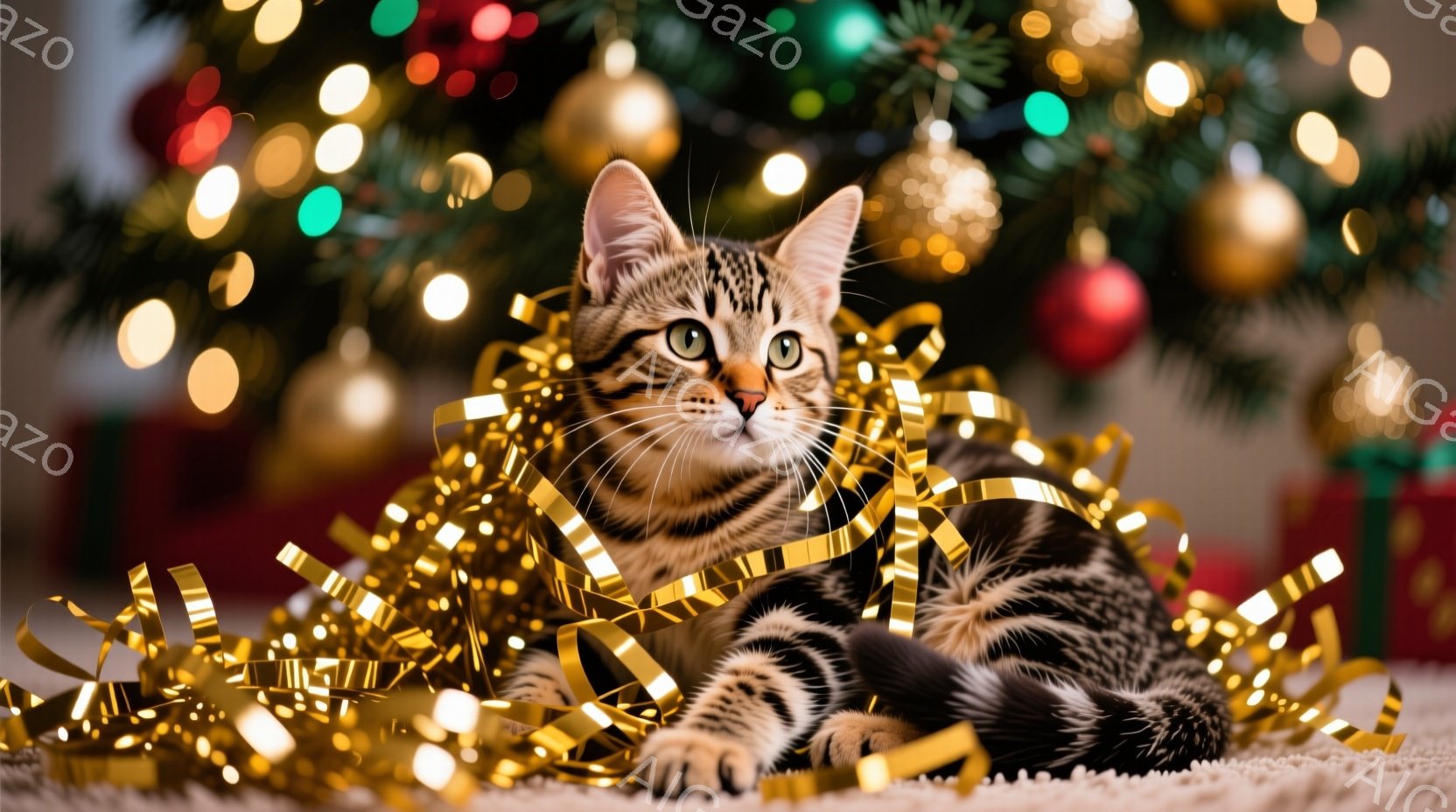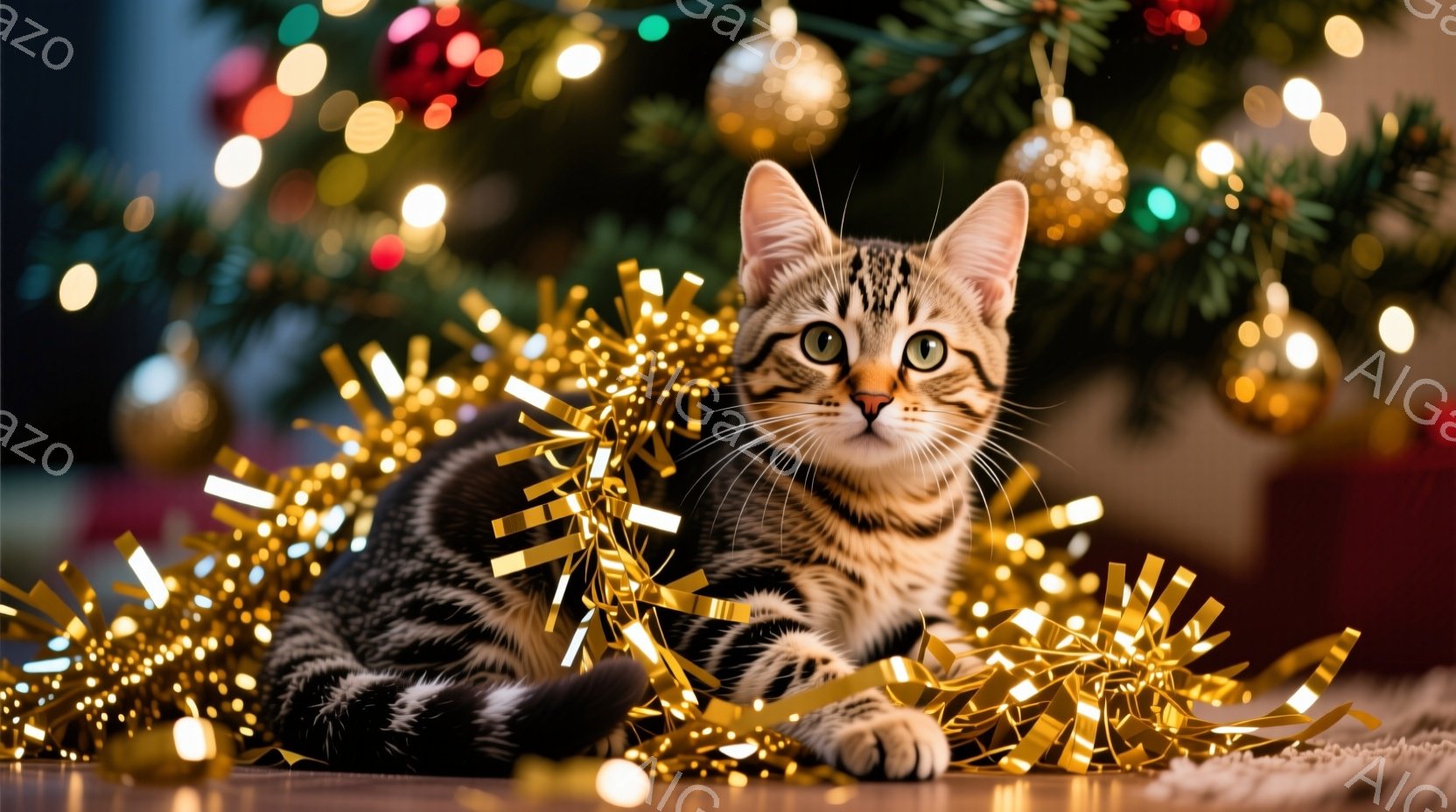 縞模様の小さな子猫が、キラキラと光る金色の飾り付けに囲まれて床に横たわっています。子猫は緑色の瞳でカメラを見つめ、少しいたずらっぽい表情を浮かべています。背景には、ぼやけたクリスマスツリーとカラフルなオーナメントが見え、温かくお祝いムードに満ちた雰囲気です。