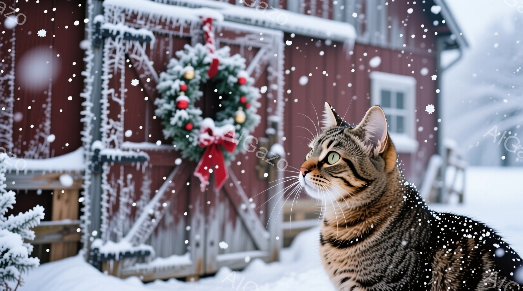 茶色の縞模様の猫が雪に覆われた庭で、少し上を見上げています。背景には赤い外壁に飾り付けられたクリスマスリースがあり、雪が降り積もる冬の風景が広がっています。全体的に温かく、静かで、お祝いの雰囲気が漂っています。