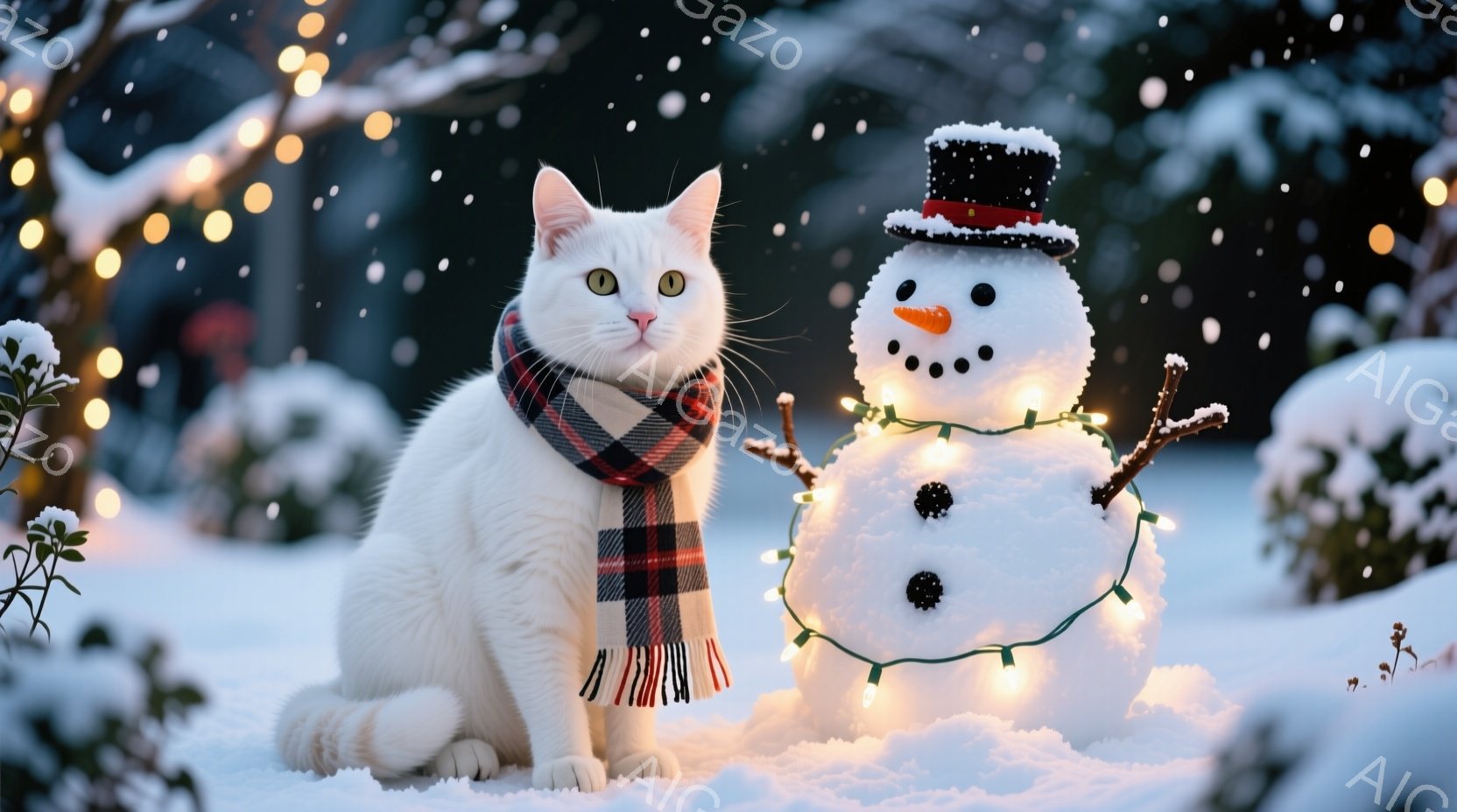 白い猫が窓辺に座り、外の雪景色を眺めている。窓には雪の結晶模様が描かれ、背景にはぼやけた光の粒子が舞う冬の夜の情景が広がっている。温かい光を放つキャンドルやクリスマスツリーの飾り付けが、猫の白い毛並みと相まって、温かく幻想的な雰囲気を醸し出している。