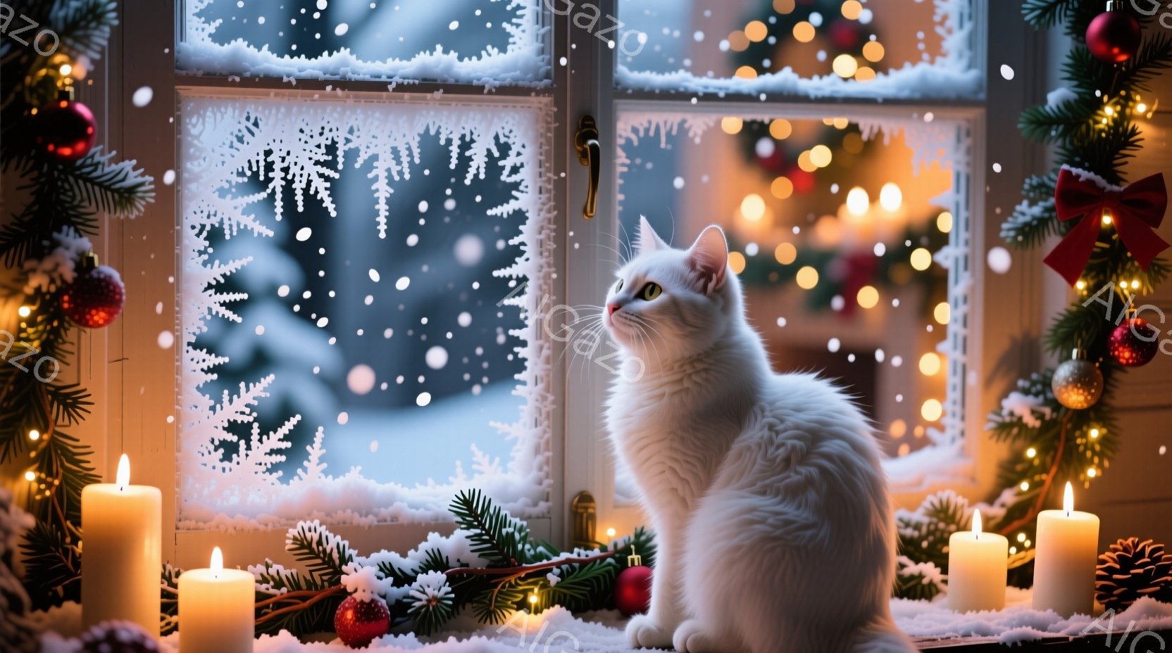 白い猫が窓辺に座り、外の雪景色を見つめている。背景には、雪の結晶で飾られた窓、点灯されたキャンドル、そしてクリスマスの飾り付けがされた木があり、暖かく幻想的な雰囲気を醸し出している。雪が降る冬の夜の、穏やかで平和な光景が表現されている。