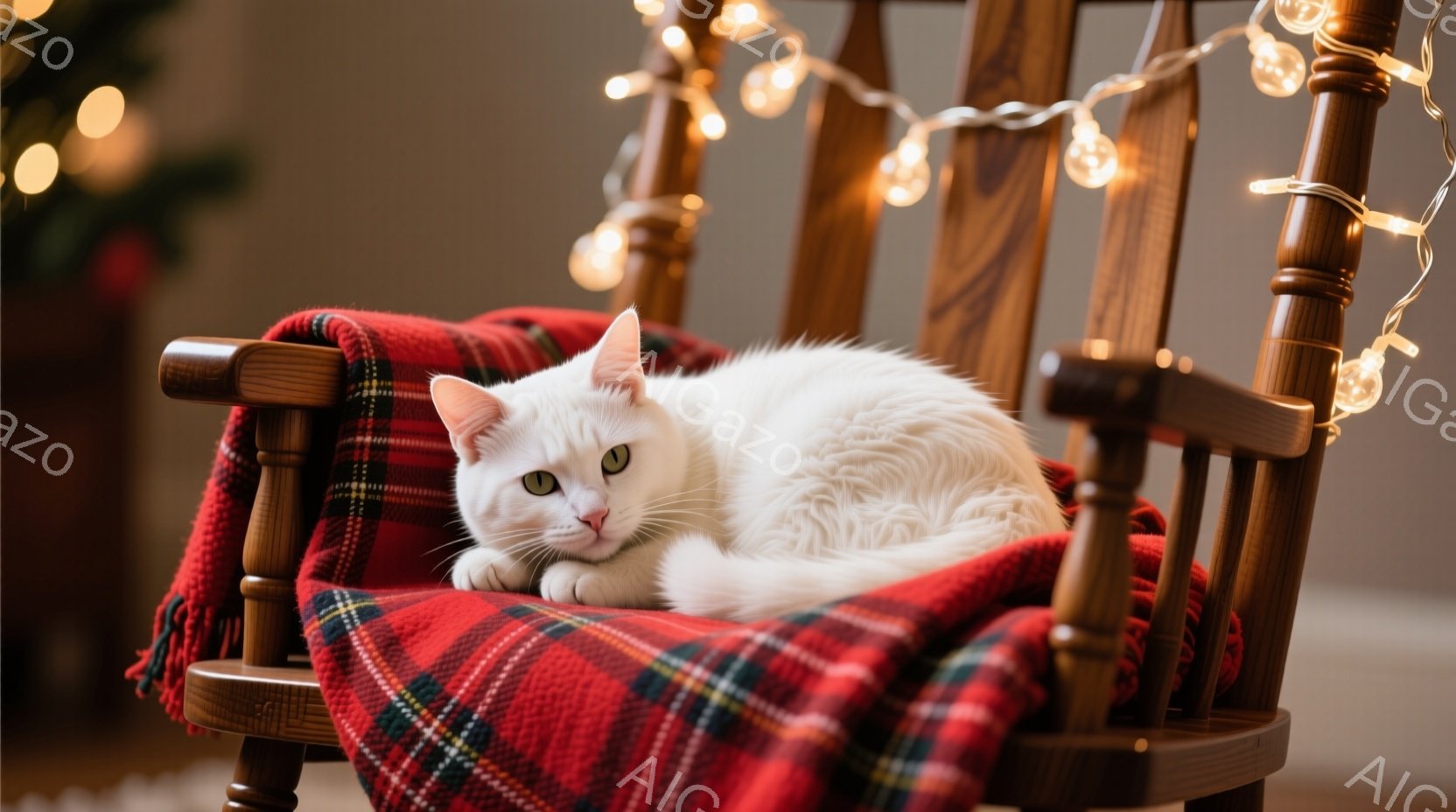 白い猫が、赤いチェック柄のブランケットが掛けられた揺り椅子に丸まって横たわっています。猫は目を細め、リラックスした表情をしています。背景は濃い緑色で、椅子の上には暖かい光を放つイルミネーションが飾られ、穏やかで心地よい雰囲気を作り出しています。