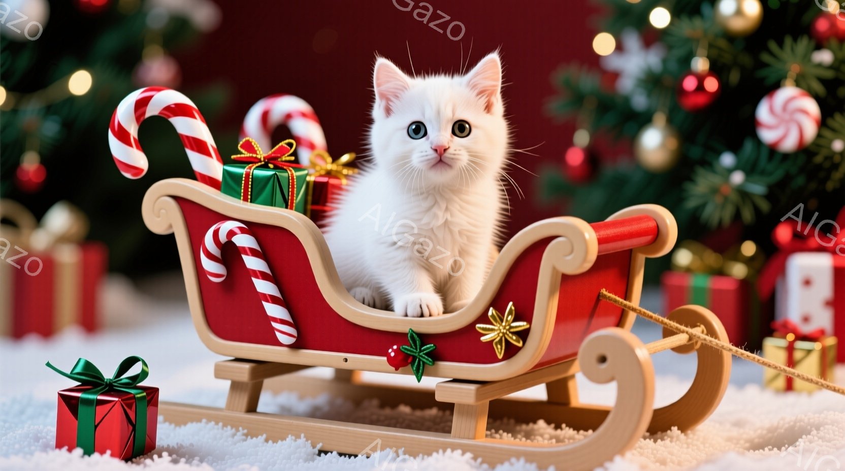 白い子猫が赤いそりに乗っており、クリスマスプレゼントのような緑色の箱がいくつか周りに置かれています。そりはロープで引かれ、子猫は前を見つめており、少し好奇心旺盛な表情をしています。背景には緑のクリスマスツリーと様々なクリスマスオーナメントが飾られ、雪が積もった床の上で、暖かくお祝いの雰囲気が漂っています。