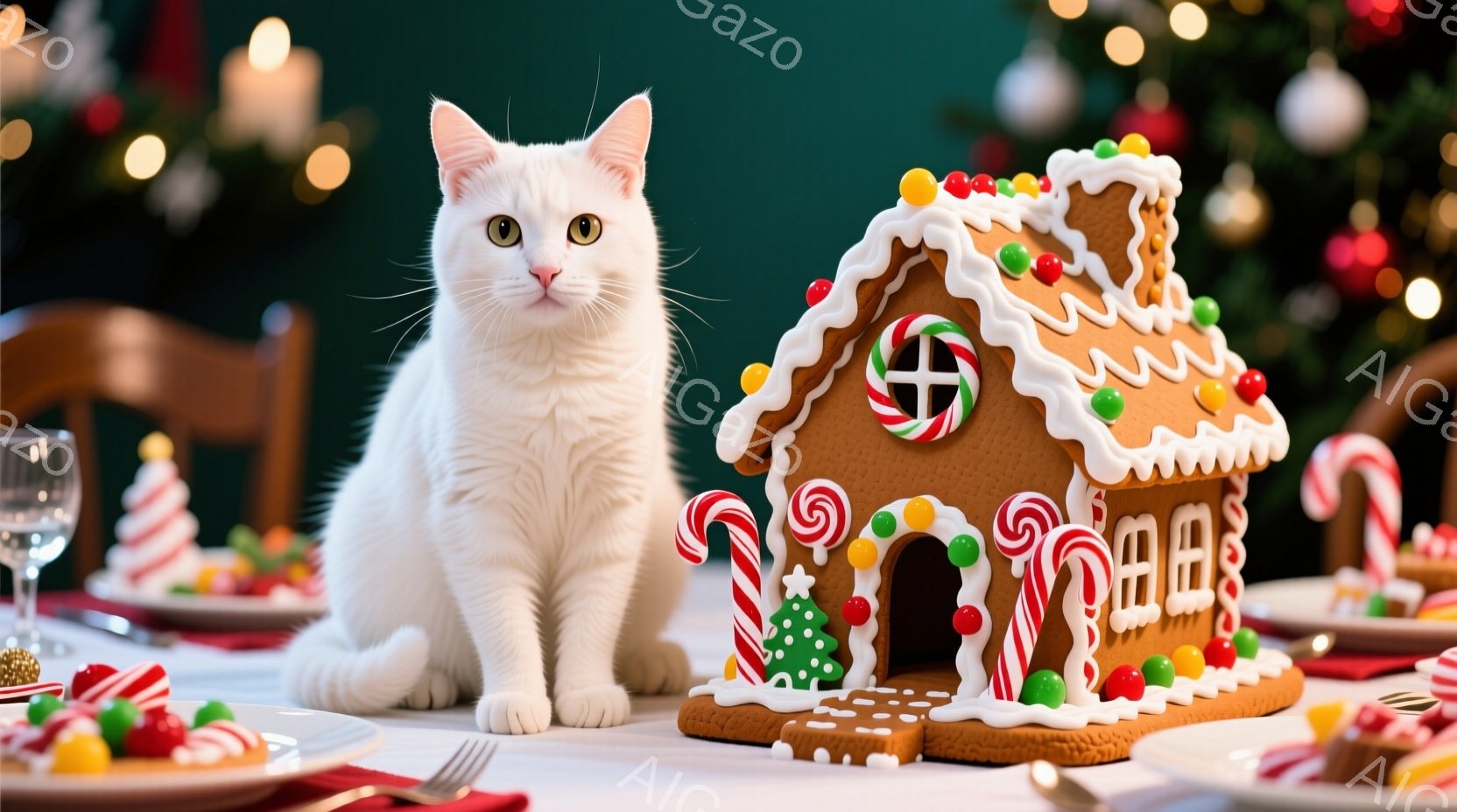 白い猫が、クリスマスのジンジャーブレッドハウスの隣に座っています。背景には、装飾されたクリスマスツリーと食卓が見え、お菓子や食器が置かれています。温かく、お祝いの雰囲気で、猫は静かに座り、クリスマスの雰囲気を楽しんでいるようです。