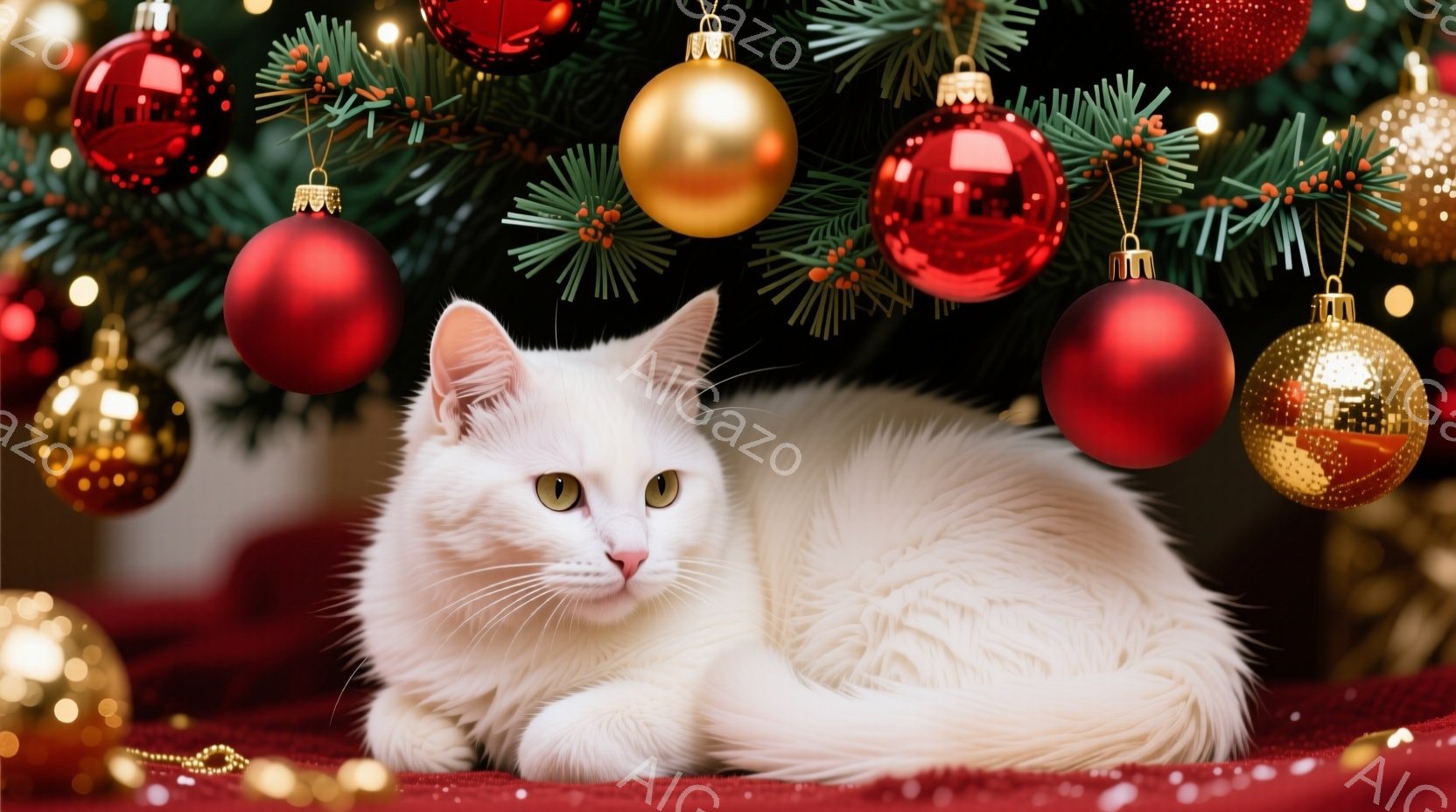 白い毛並みの猫が、赤い敷物の上に横たわっています。猫は緑のクリスマスツリーの前にいて、様々な色のクリスマスオーナメントに囲まれています。全体的に暖かく、お祝いムードに満ちた雰囲気です。