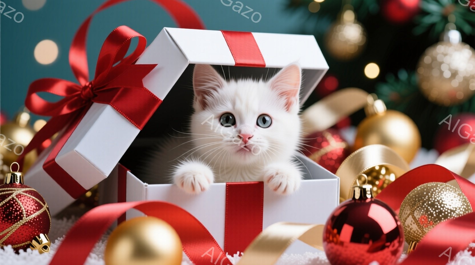 白い子猫が赤いリボンで結ばれた開いたギフトボックスの中からこちらを見ています。子猫は箱の中に前足を伸ばし、好奇心と遊び心にあふれた表情をしています。背景には、赤い、金色の、そしてキラキラと輝くクリスマスオーナメントが散りばめられ、温かくお祝いムードに満ちた雰囲気です。