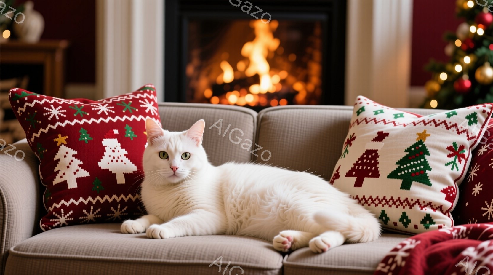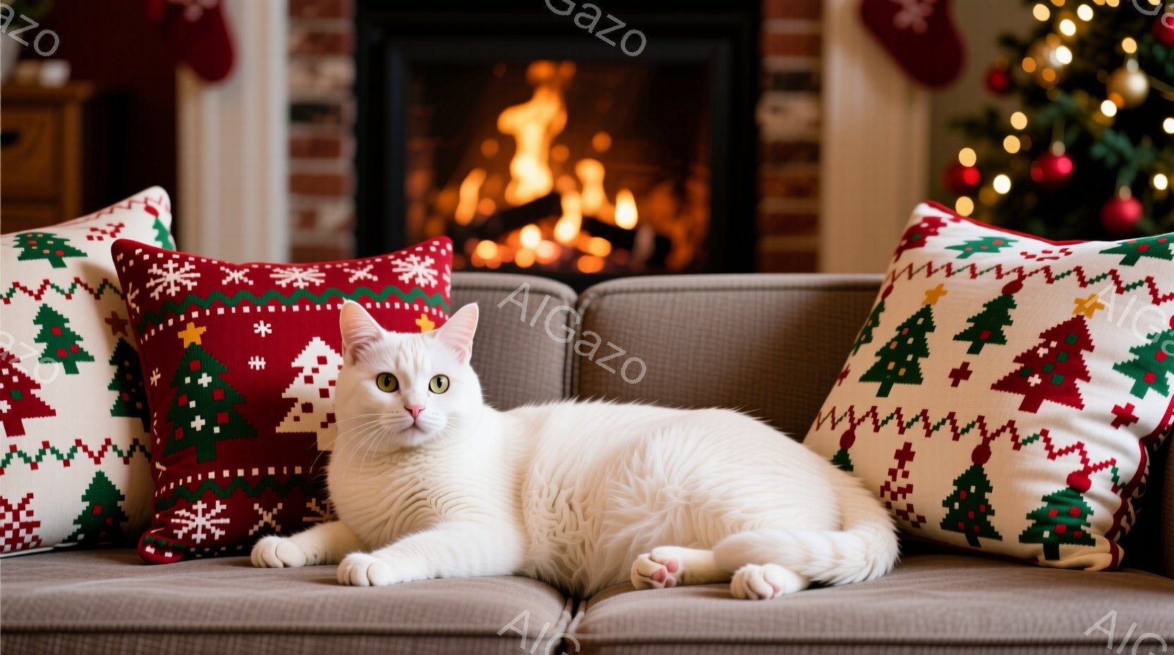 白い猫が、クリスマス柄のクッションに囲まれた灰色のソファでリラックスして横たわっています。背景には暖炉があり、火が燃えて暖かさを感じさせ、クリスマスツリーのぼんやりとした光がクリスマスシーズンであることを示唆しています。全体的に、温かく、居心地の良い、お祝いの雰囲気です。