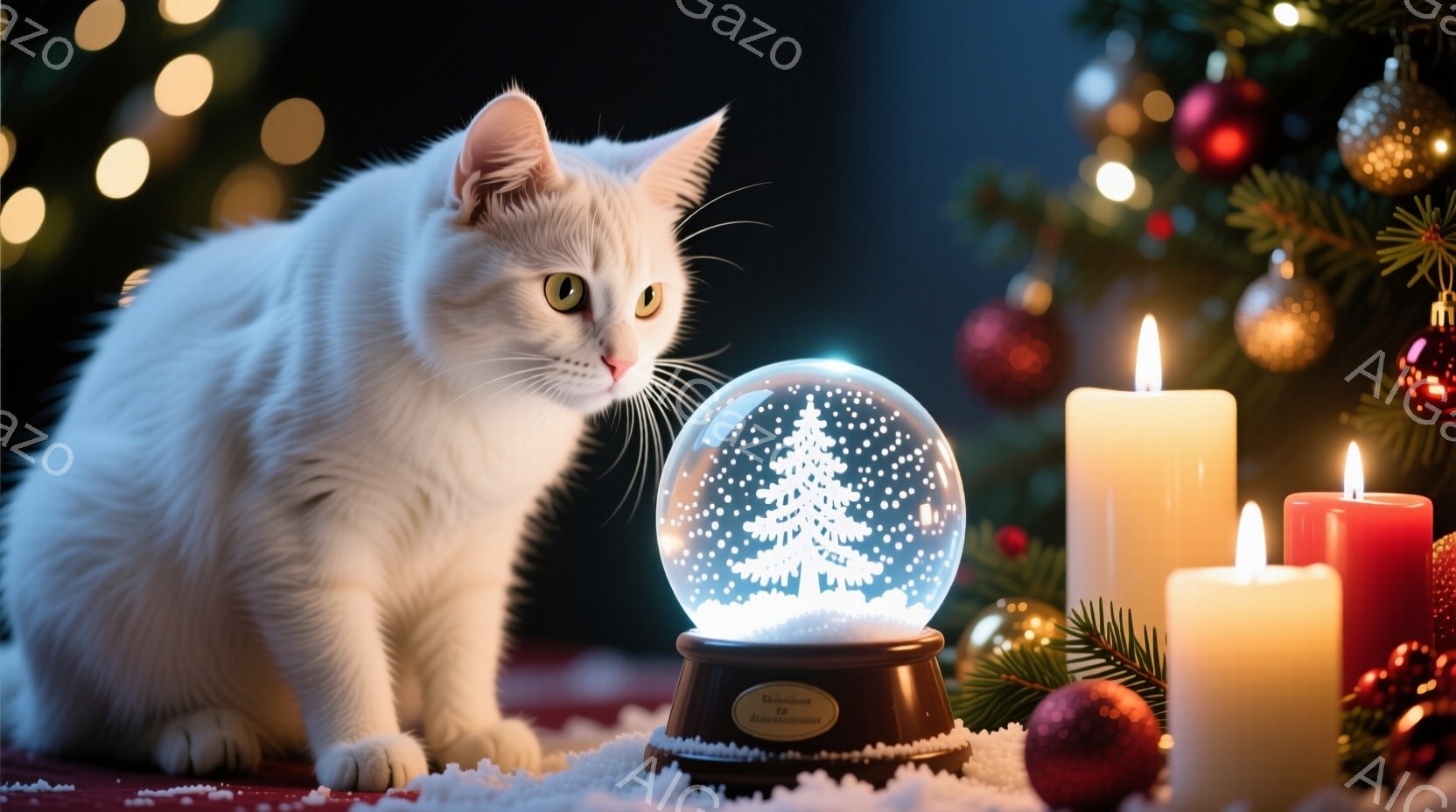 白い毛並みの猫が、雪の降るクリスマスのオーナメントであるスノーグローブをじっと見つめている。暖かく優しい光を放つキャンドルが数本、オーナメントの隣に置かれ、背景にはぼやけたクリスマスツリーの飾りが見える。全体的に、温かく、穏やかで、冬のクリスマスの雰囲気が漂っている。