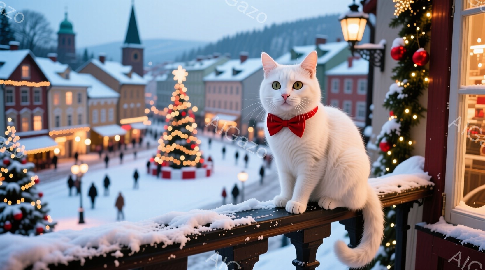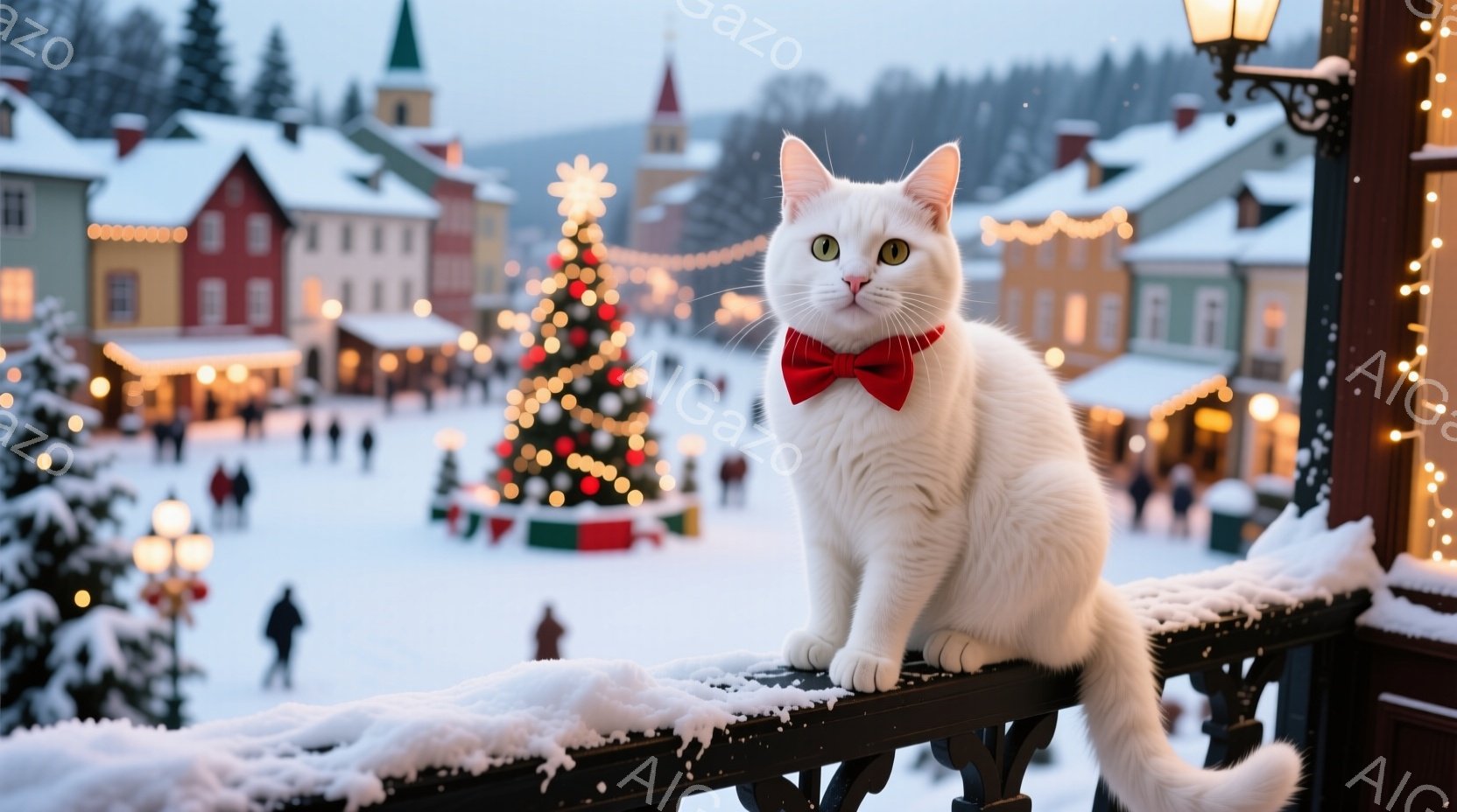 白い猫がクリスマスの飾り付けられた欄干に座り、赤い蝶ネクタイを締めてカメラを見つめている。背景には雪に覆われた街並みと、クリスマスツリーが飾られた賑やかな広場が広がり、冬の温かく幻想的な雰囲気を醸し出している。建物はカラフルで、遠くには雪をまとった山々が見える。