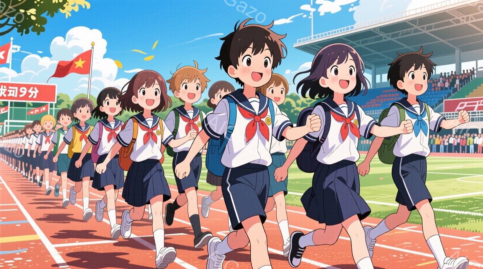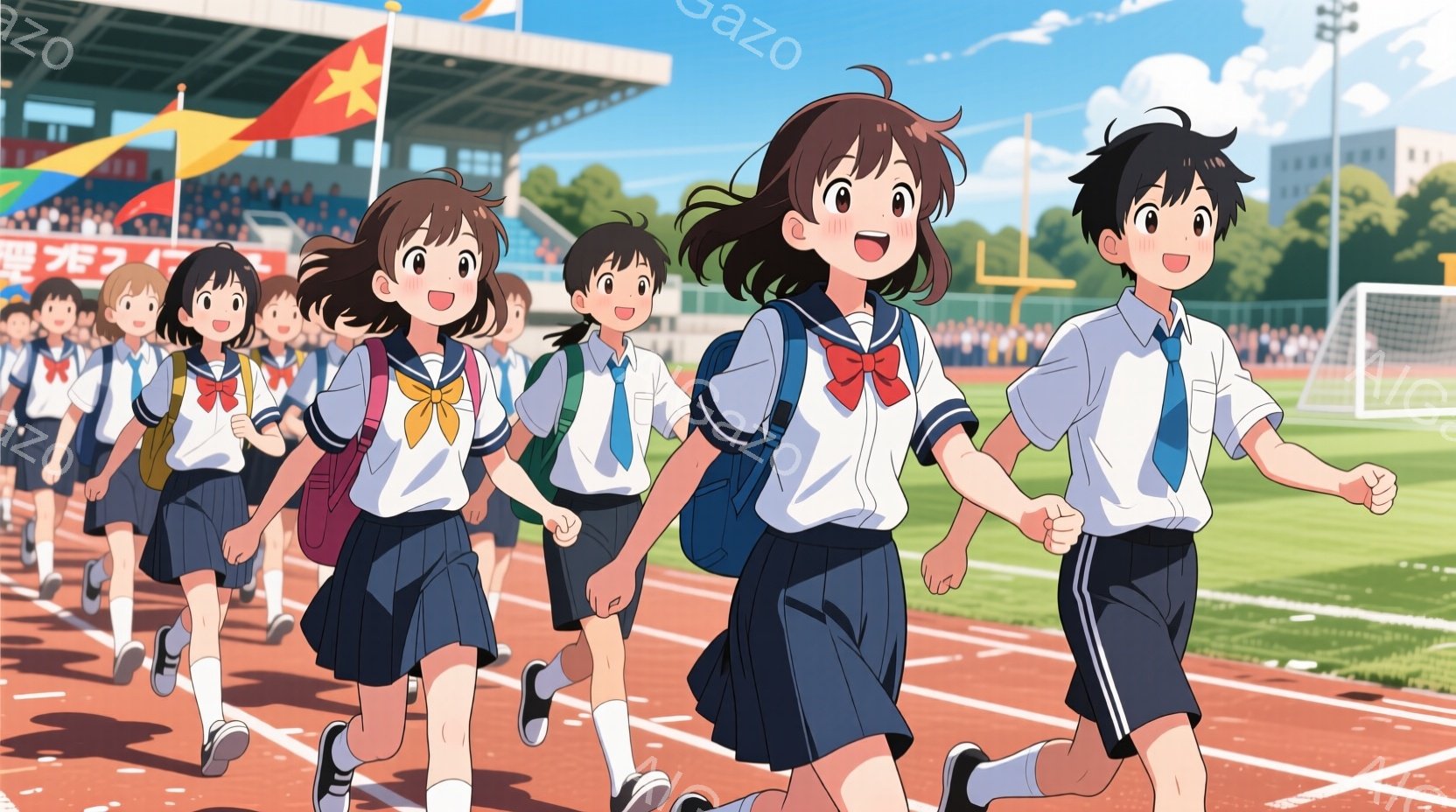 この無料AI生成画像「運動場で走る女子高生たちが描かれています。紺色のスカートと白いブラウス、リボンネクタイという制服姿で、皆笑顔で楽しそうにしています。背景には観客席と緑の木々、青空が広がり、明るく活気のある雰囲気が伝わってきます。」は、2025年10月25日に作成されました。 サイズは 1664×928px の高解像度で、商用利用も可能なフリー素材として提供しています。