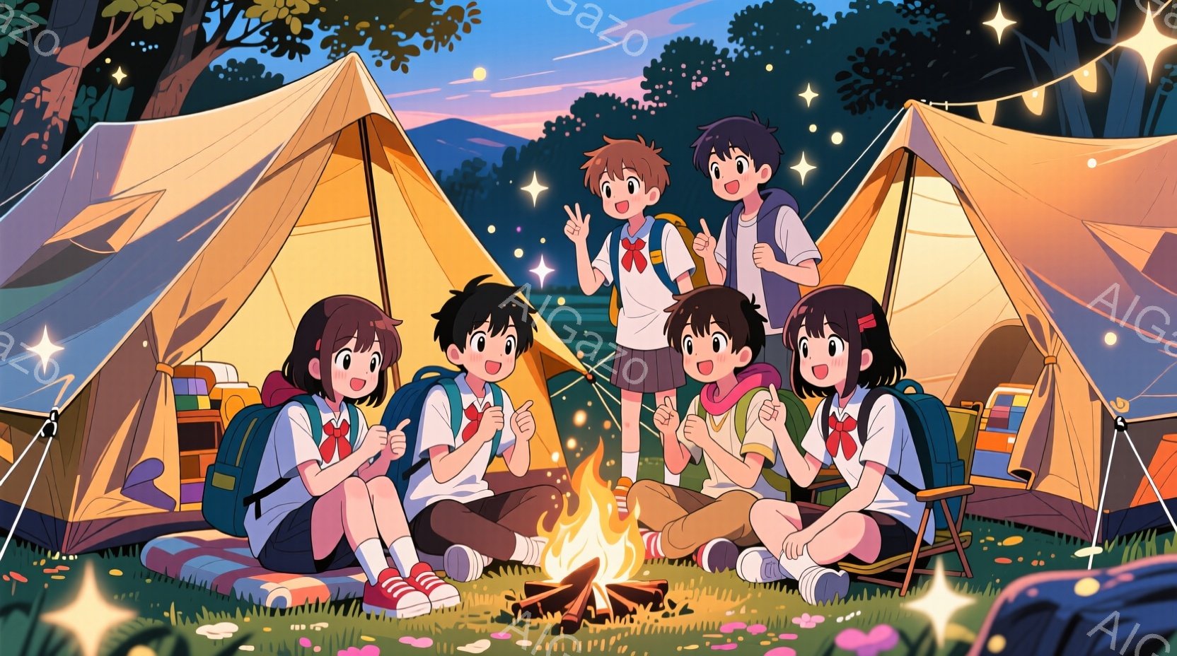 この無料AI生成画像「青空の下、緑の草原にテントが張られたキャンプ風景が描かれています。制服姿の男女5人が、楽しげな表情で座り込み、誰かが地図を広げています。背景には木々が生い茂り、太陽の光が差し込み、明るく爽やかな雰囲気が漂っています。」は、2025年10月25日に作成されました。 サイズは 1664×928px の高解像度で、商用利用も可能なフリー素材として提供しています。