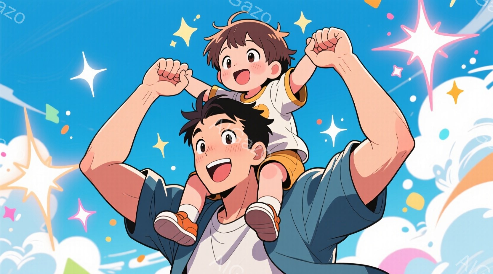 少年は、父親の肩に乗って両手を上げて喜んでいます。父親は白いTシャツと青いショーツ姿で、息子を見下ろして笑顔を浮かべています。背景は水色で、星や光の粒子が散りばめられており、全体的に明るく幸せな雰囲気です。