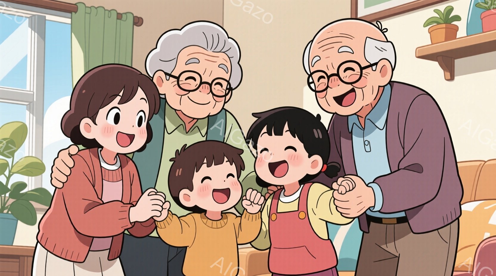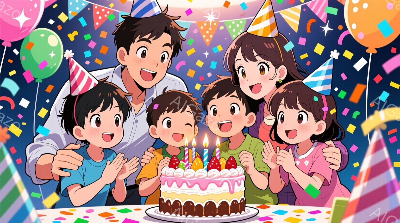 ケーキの前に座った家族が描かれています。母親は赤いニットを着ており、髪は肩まで伸びています。二人の娘はオレンジ色のシャツを着ており、それぞれ片手に手を上げ、喜びの表情を浮かべています。父親は青いシャツを着ており、ケーキを指さして微笑んでいます。背景には色とりどりの紙吹雪が舞い、楽しいお祝いの雰囲気を醸し出しています。