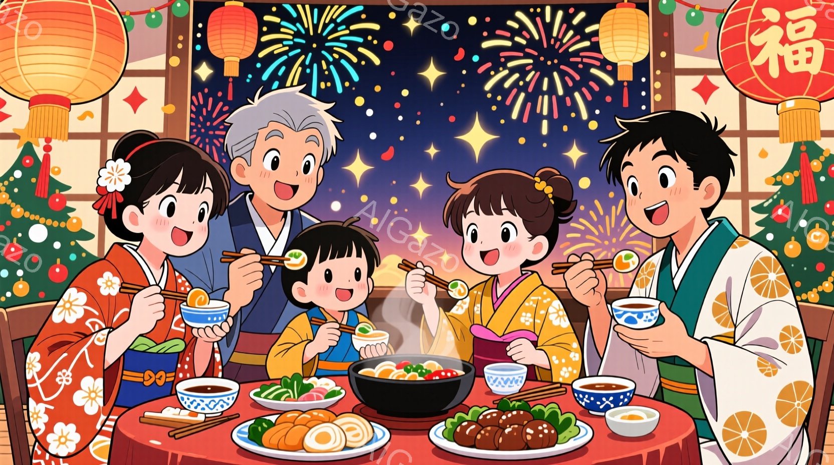 この無料AI生成画像「家族が円卓を囲んで鍋料理を楽しんでいる様子が描かれています。皆、伝統的な和服を着ており、笑顔で鍋料理に手を伸ばしたり、お酒を飲んだりしています。背景には提灯や花火が飾られ、温かく賑やかなお正月またはお祝いの雰囲気が漂っています。」は、2025年10月25日に作成されました。 サイズは 1664×928px の高解像度で、商用利用も可能なフリー素材として提供しています。