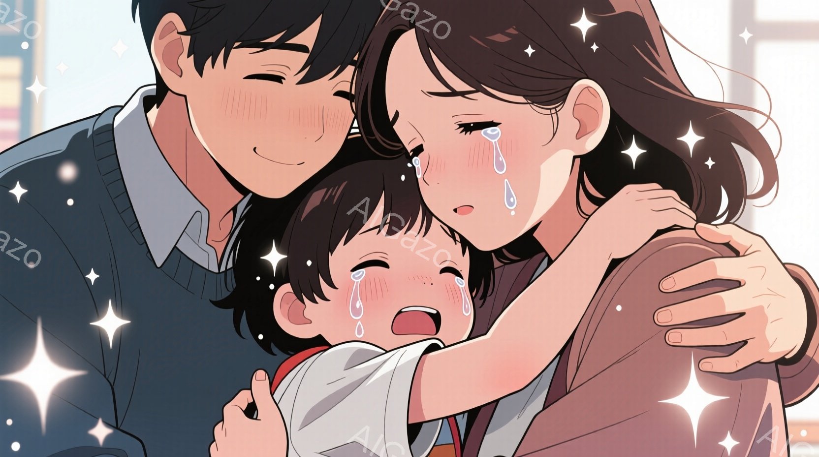 この無料AI生成画像「幼い子供が女性に強く抱きしめられているイラストです。女性は茶色の髪をサイドに流し、泣いており、子供も涙を流した表情をしています。背景は淡いピンク色で、キラキラと輝く星のような装飾が散りばめられており、温かく切ない雰囲気を醸し出しています。」は、2025年10月25日に作成されました。 サイズは 1664×928px の高解像度で、商用利用も可能なフリー素材として提供しています。