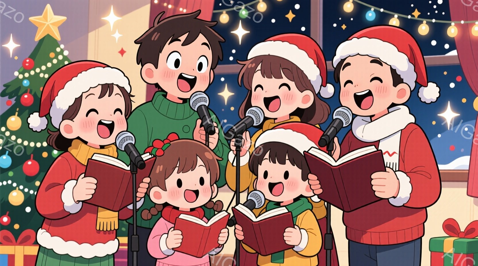 暖炉とクリスマスツリーを背景に、子供たちがクリスマスのキャロルを歌っている様子が描かれています。赤いサンタの帽子をかぶった女の子や、セーターを着た子供たちは皆笑顔で、手に持った楽譜を見ながらマイクに向かって歌っています。背景にはプレゼントボックスや星形の装飾が散りばめられ、暖かく幸せなクリスマスの雰囲気が伝わってきます。