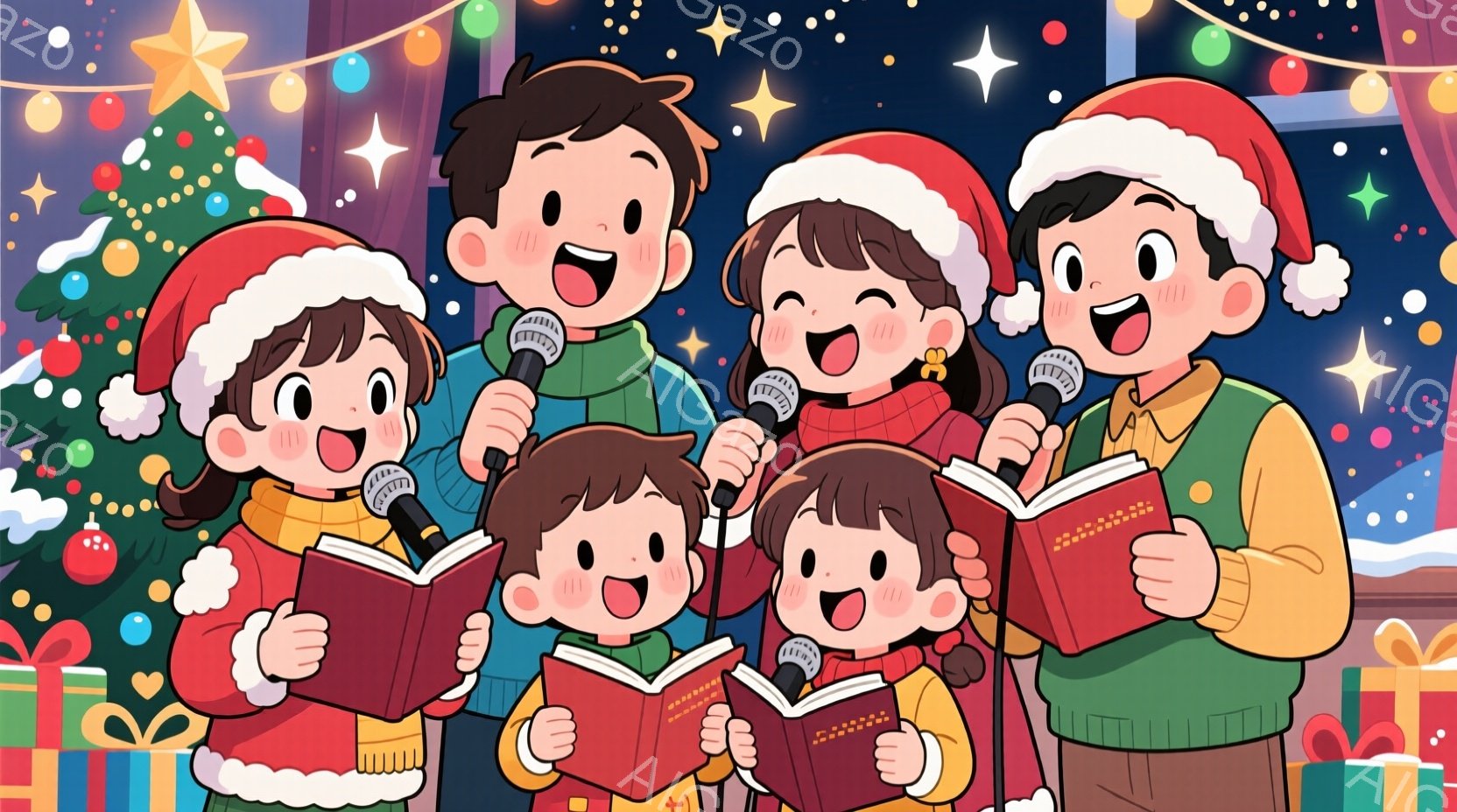 この無料AI生成画像「暖炉とクリスマスツリーを背景に、子供たちがクリスマスのキャロルを歌っている様子が描かれています。赤いサンタの帽子をかぶった女の子や、セーターを着た子供たちは皆笑顔で、手に持った楽譜を見ながらマイクに向かって歌っています。背景にはプレゼントボックスや星形の装飾が散りばめられ、暖かく幸せなクリスマスの雰囲気が伝わってきます。」は、2025年10月25日に作成されました。 サイズは 1664×928px の高解像度で、商用利用も可能なフリー素材として提供しています。