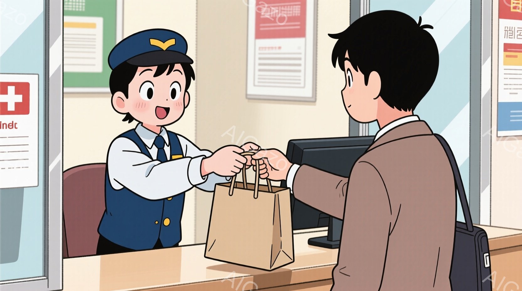 制服を着た若い女性が、茶色の紙袋を男性に渡している場面です。女性は紺色の制服に赤いネクタイ、帽子を着用し、笑顔で紙袋を差し出しています。背景には受付のようなカウンターとポスターがあり、全体的に明るく親切な雰囲気です。