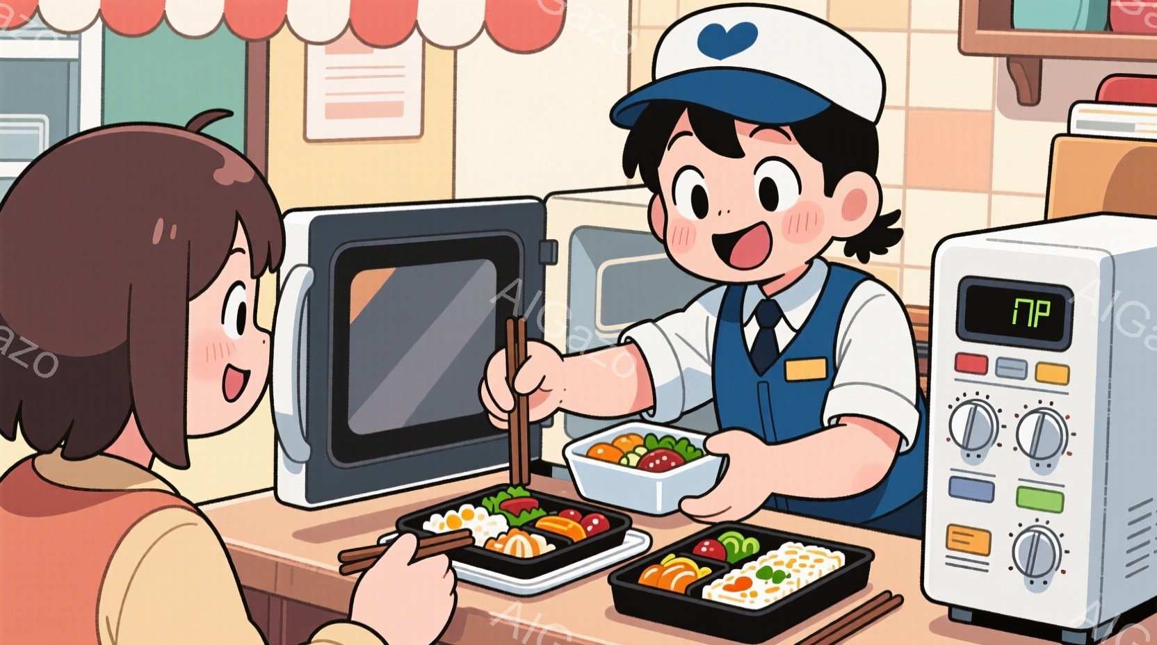 少年は、白いシャツにエプロン、帽子をかぶった姿で、お弁当箱に箸をセットしています。彼は笑顔で、お弁当を準備している様子が伺えます。背景には電子レンジや調理台があり、キッチンの一室でのお弁当作り風景が描かれています。