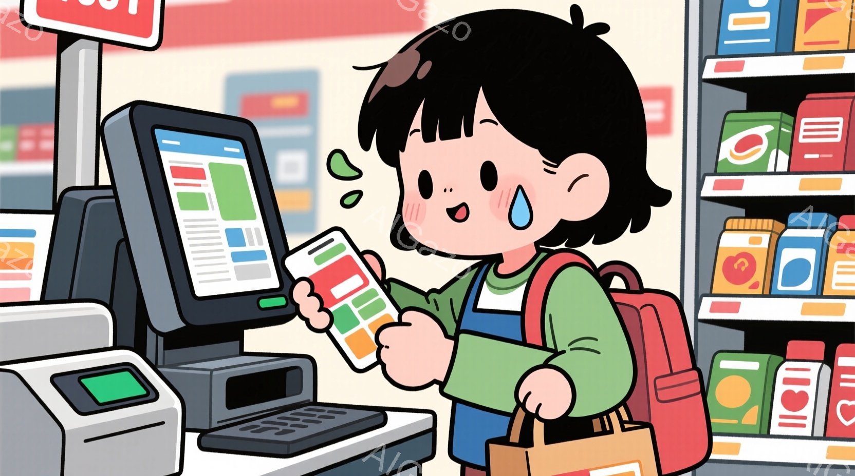 茶色のショートヘアの少女が、スーパーマーケットのレジの前でスナック菓子を持っている。彼女は青いシャツにエプロンをつけ、背中に赤いリュックサックを背負っており、少し悲しそうな表情をしている。背景には商品が並んだ棚が見え、全体的に明るくポップな雰囲気のイラストである。