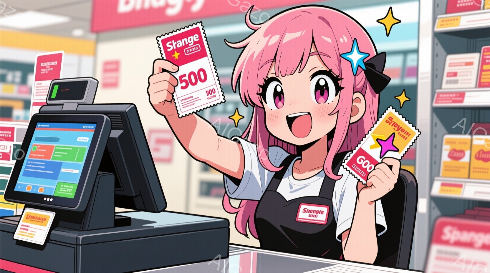 明るいピンク色の髪をツインテールにした若い女性が、レジカウンターの前で両手にチケットを掲げて笑顔を浮かべている。彼女は白いブラウスにエプロンを着用し、全体的に元気で活気のある印象を与える。背景にはレジや商品が並び、明るい色調で構成されており、商業施設の一角のような雰囲気である。