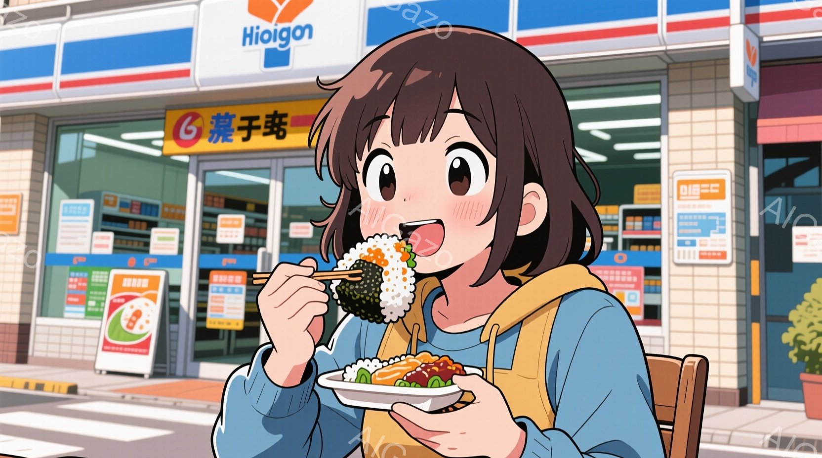 若い男性がコンビニの前で、おにぎりと様々な惣菜が盛られたトレーを美味しそうに食べている。彼は茶色の髪で、ブルーのパーカーとベージュのベストを着用し、驚いたような満面の笑みを浮かべている。背景には、鮮やかな看板が並ぶコンビニエンスストアと緑豊かな植物が見え、晴れた日の賑やかな雰囲気が漂っている。