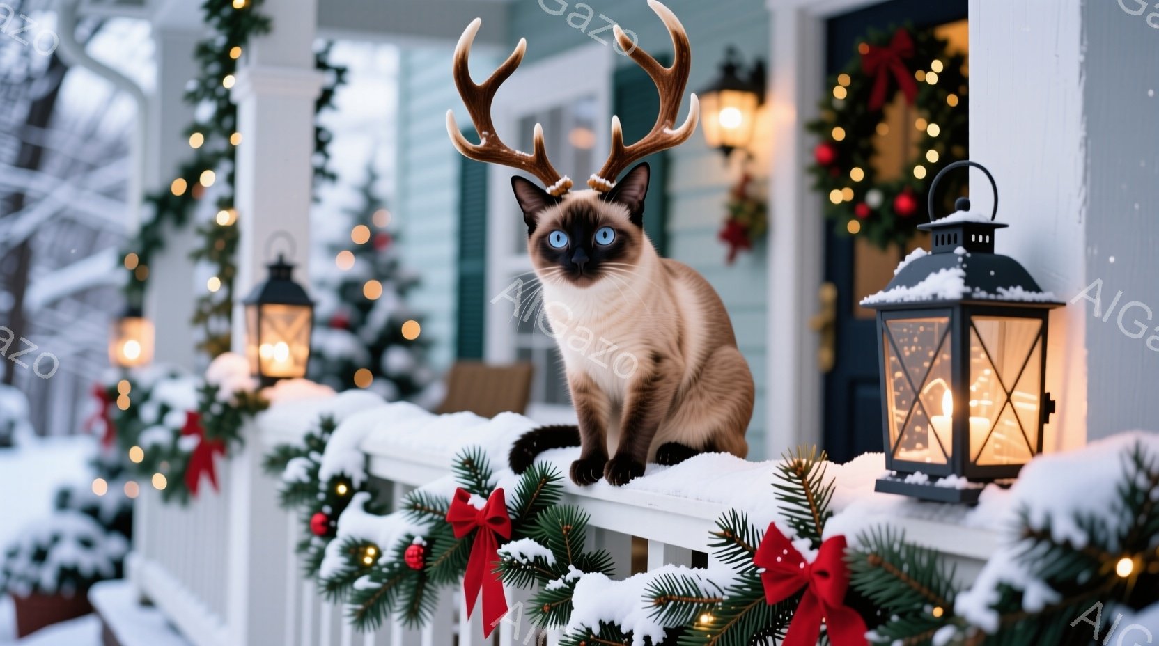 シーマル猫がクリスマスの飾り付けられた玄関の壁に座っており、頭には小さなトナカイの角をつけている。背景には雪で覆われた庭と、点灯したクリスマスライトで飾られた植木鉢やランタンが見える。全体的に、温かく、お祝いの雰囲気の冬の光景である。