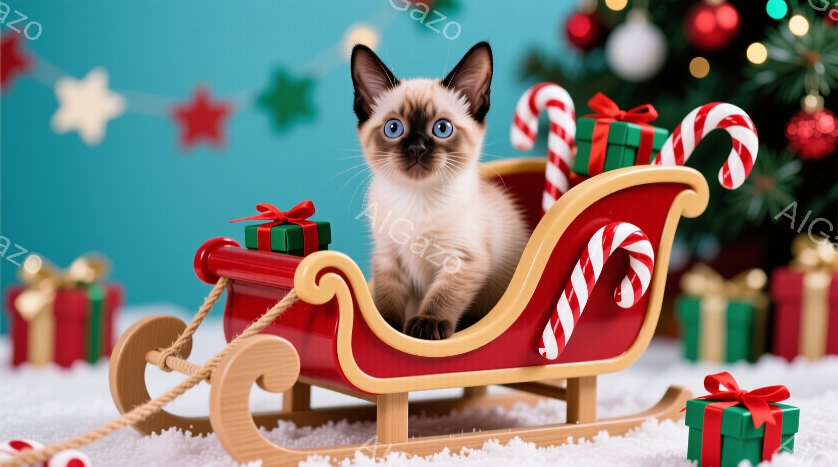 小さなシャム猫が、赤いそりに座ってこちらを見ています。そりの周りにはキャンディケーンや緑と赤のリボンで飾られたプレゼントボックスが置かれ、白い雪の上に並んでいます。背景にはクリスマスツリーがぼやけて見え、暖かくお祝いの雰囲気を感じさせます。