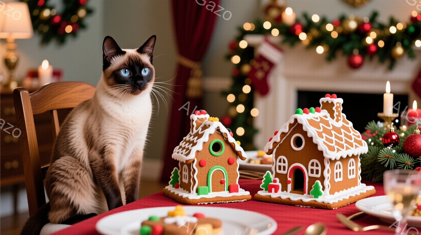 クリスマスを祝うような暖炉とクリスマスツリーが背景に見える、赤いテーブルの上にシベリアン猫が座っています。テーブルにはジンジャーブレッドハウスと、小さなデザートが盛られたお皿がいくつか置かれており、猫は落ち着いた表情で正面を見つめています。全体的に、温かく、祝祭的な雰囲気が漂う画像です。