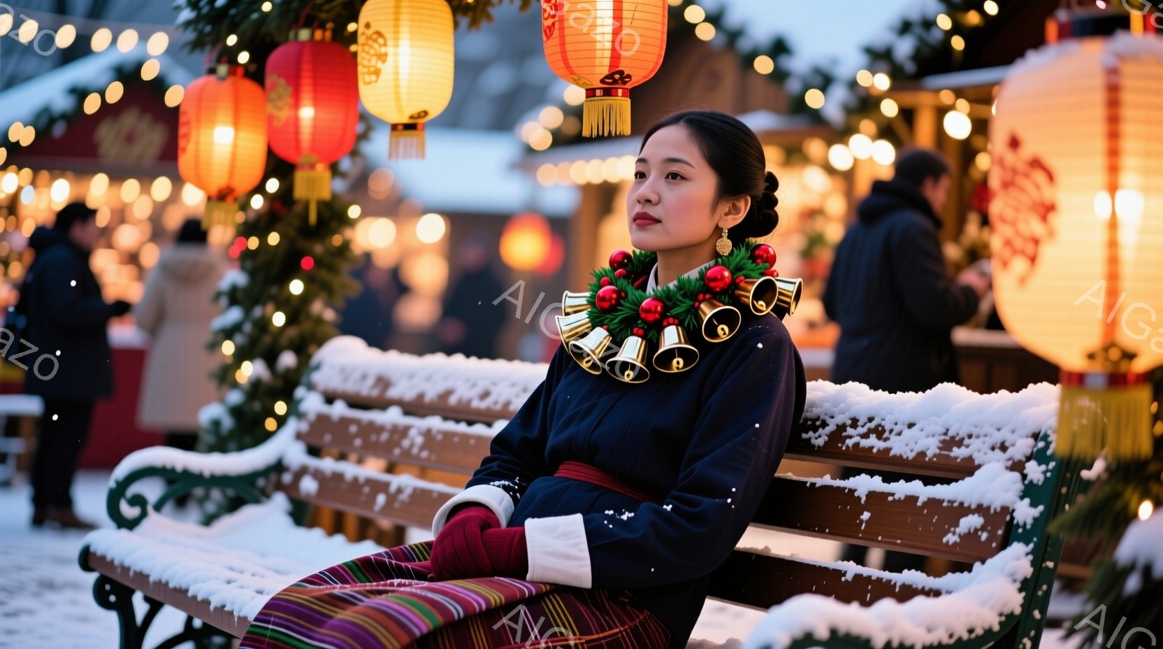 鮮やかな紫色のジャケットを着た男性が、雪で覆われた公園のベンチに座っています。首にはカラフルなベルのネックレスが飾られており、黒い手袋をはめています。背景にはクリスマスマーケットのような賑やかな光景が広がり、雪が舞い散る冬の夜の温かく幻想的な雰囲気が漂っています。
