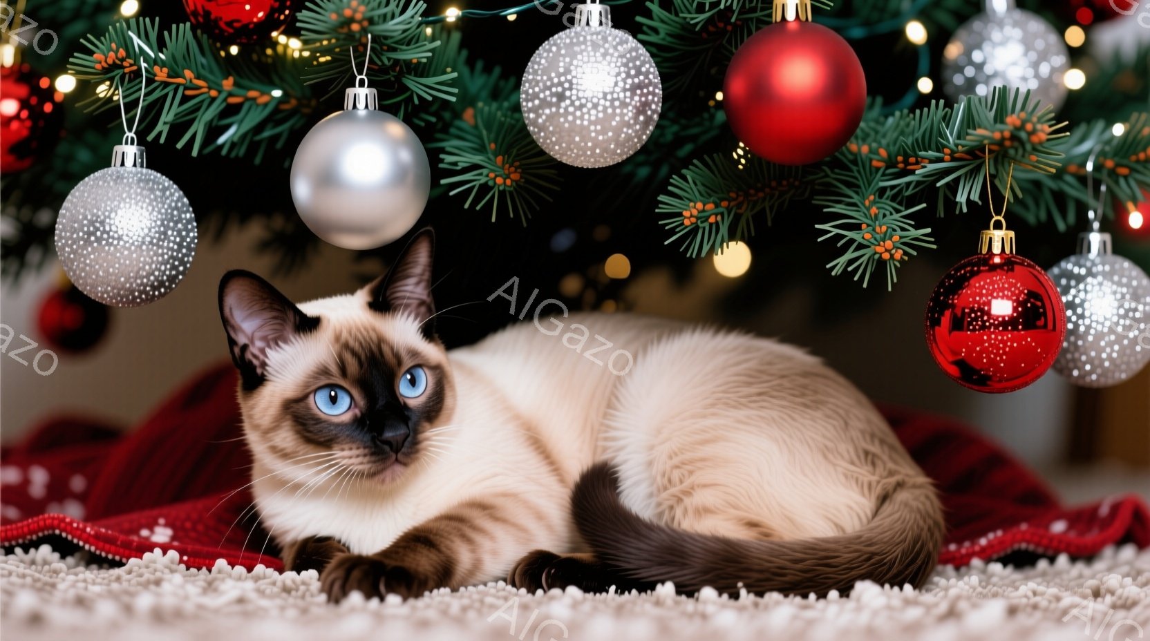 シーマル猫が赤い布の上に丸まって横たわっており、鮮やかな青い目がカメラを見つめている。背景には、クリスマスツリーの枝と、赤と銀のオーナメントが飾られているのが見える。全体的に、温かく、お祝いムードにあふれた雰囲気である。