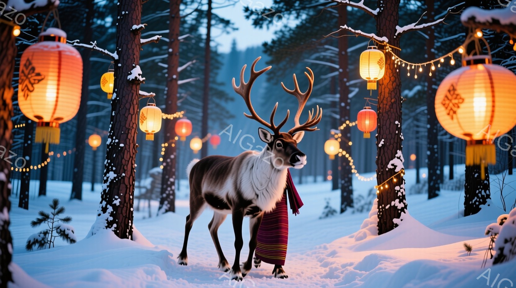 雪に覆われた森林の中で、角を持つトナカイと着物を着た男性が写っている。男性は濃い緑色の着物と赤い帯を締め、黒髪を短く整え、やや真剣な表情で前を見据えている。背景には雪で覆われた木々が立ち並び、オレンジ色の提灯が吊るされ、幻想的な雰囲気を醸し出している。