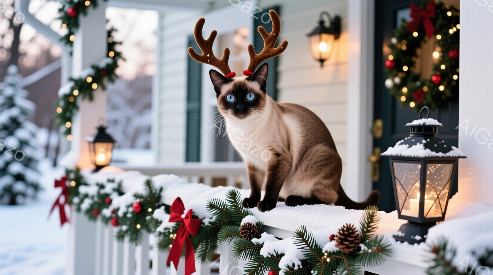 雪で覆われた家の玄関に、角のある帽子をかぶったシャム猫が座っています。猫は前方をまっすぐ見つめ、凛とした表情をしています。背景にはクリスマス装飾が施された玄関ドアと、雪の積もった庭があり、冬の穏やかな雰囲気を醸し出しています。