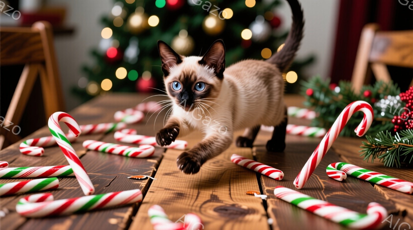 濃い木目のテーブルの上を、美しいシャム猫が活発に走り回っている。テーブルには折れたキャンディケーンが散らばり、背景には緑のクリスマスツリーとぼやけた光の装飾が見える。暖かく、遊び心のあるクリスマスの雰囲気が漂っている。