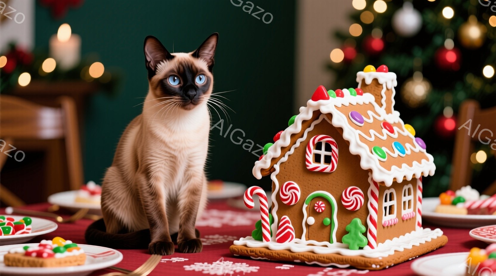この無料AI生成画像「シベリアンハスキーのような毛並みの猫が、クリスマスのサンタの衣装を着て屋根の上に座っています。赤い帽子と白いファーの縁取りが付いたマント、そして赤いリボンが愛らしいアクセントになっています。背景には雪景色が広がり、ぼんやりとした光が灯る建物や、暖かい光を放つランタンがクリスマスの温かい雰囲気を醸し出しています。」は、2025年10月25日に作成されました。 サイズは 1664×928px の高解像度で、商用利用も可能なフリー素材として提供しています。