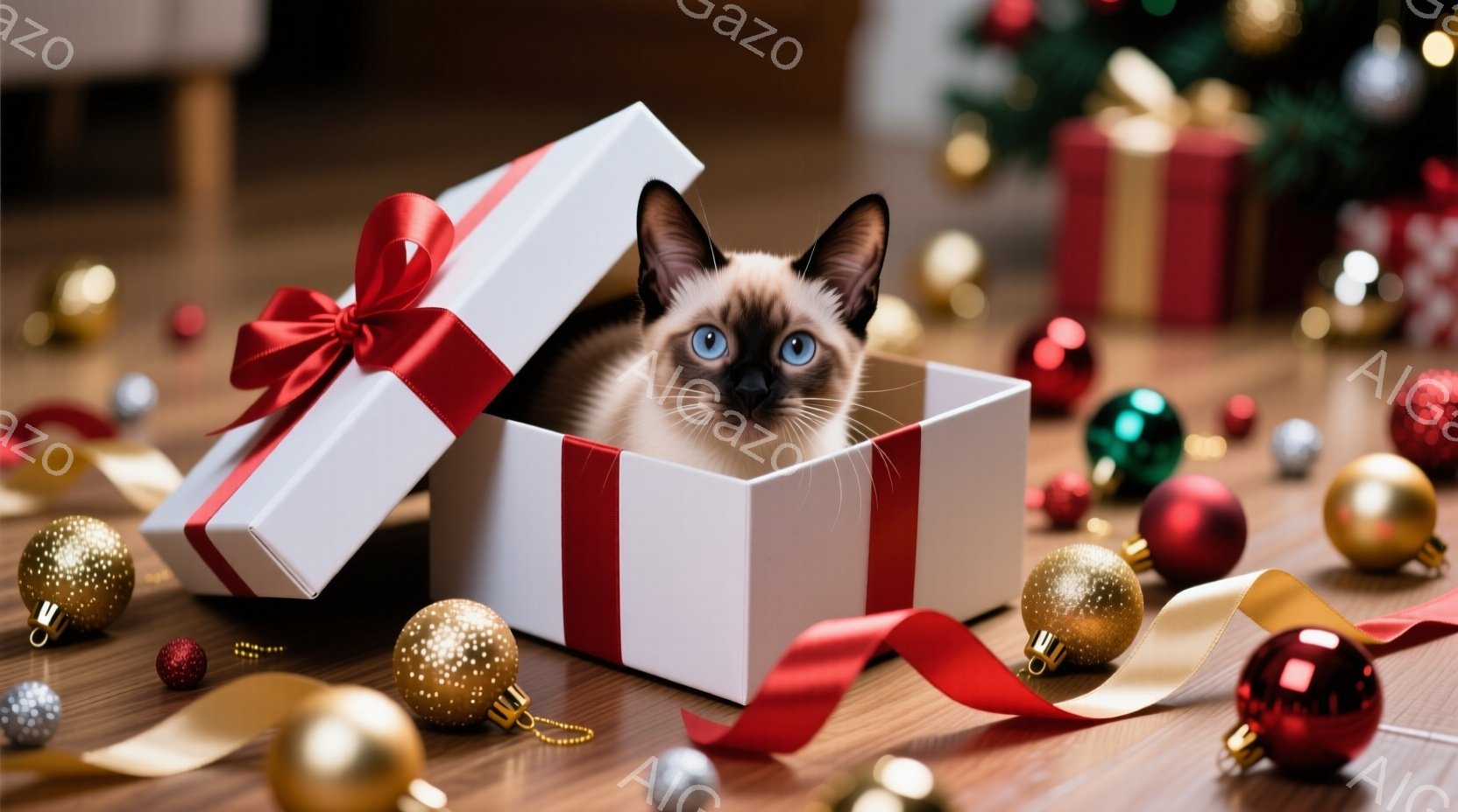 この無料AI生成画像「シベリアンハスキーのような猫が、水玉模様のグレーと赤のパジャマを着て、白い枕と赤い模様のベッドカバーの上で仰向けに寝ています。猫は目を閉じてリラックスした表情で、まるで人間のように快適に眠っています。背景には、クリスマスツリーとキラキラと輝く電飾があり、温かく居心地の良いクリスマスの雰囲気が漂っています。」は、2025年10月25日に作成されました。 サイズは 1664×928px の高解像度で、商用利用も可能なフリー素材として提供しています。
